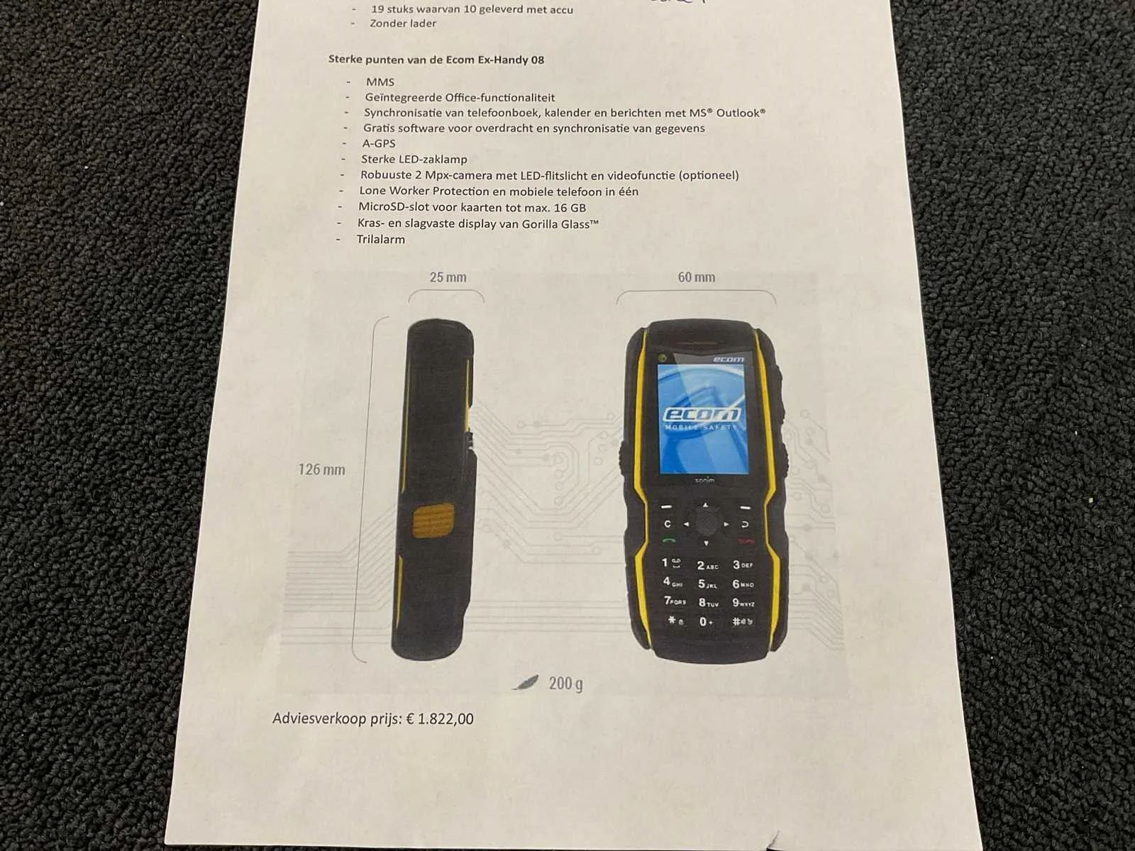 Let op! Excl. acculader. De Ex-Handy 08 is het nieuwe topmodel met certificatie voor zone 1 / divisie 1 en de eerste mobiele telefoon in het ecom-assortiment die werd uitgerust met 3G-functionaliteit. Het toestel valt op door zijn krachtige prestaties en biedt brede compatibiliteit op gebied van software en netwerkverbindingen. Afhankelijk van de gekozen configuratie verenigt het quadband-toestel tot wel vijf apparaten in één: Mobiele telefoon Lone Worker Protection (LWP) Camera met videofunctie LED-zaklamp Walkietalkie (push-to-talk) Merk: Sonim Model: Ecom Product type: Ex-Handy 08 Mps: 2mp Camera: true Zonder oplader: true