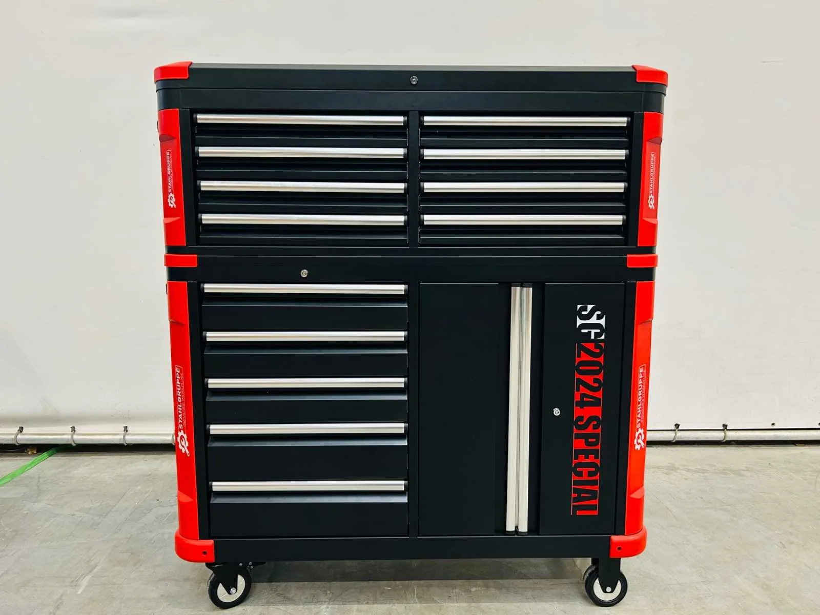 Kar met afneembare topbox; topbox met 8 laden en boven klep; Kar met 5 laden en kast met dubbele openslaande deuren; 13laden - 9 gevuld; 2 zwenkwielen waarvan 2 geremd; 7212 Merk: Stahlgruppe Model: SG2024 Type: 327-delige Kleur: rood - zwart Gewicht: 215kg Lengte: 144cm Breedte: 54cm Hoogte: 154cm