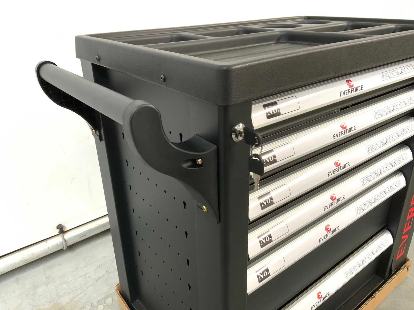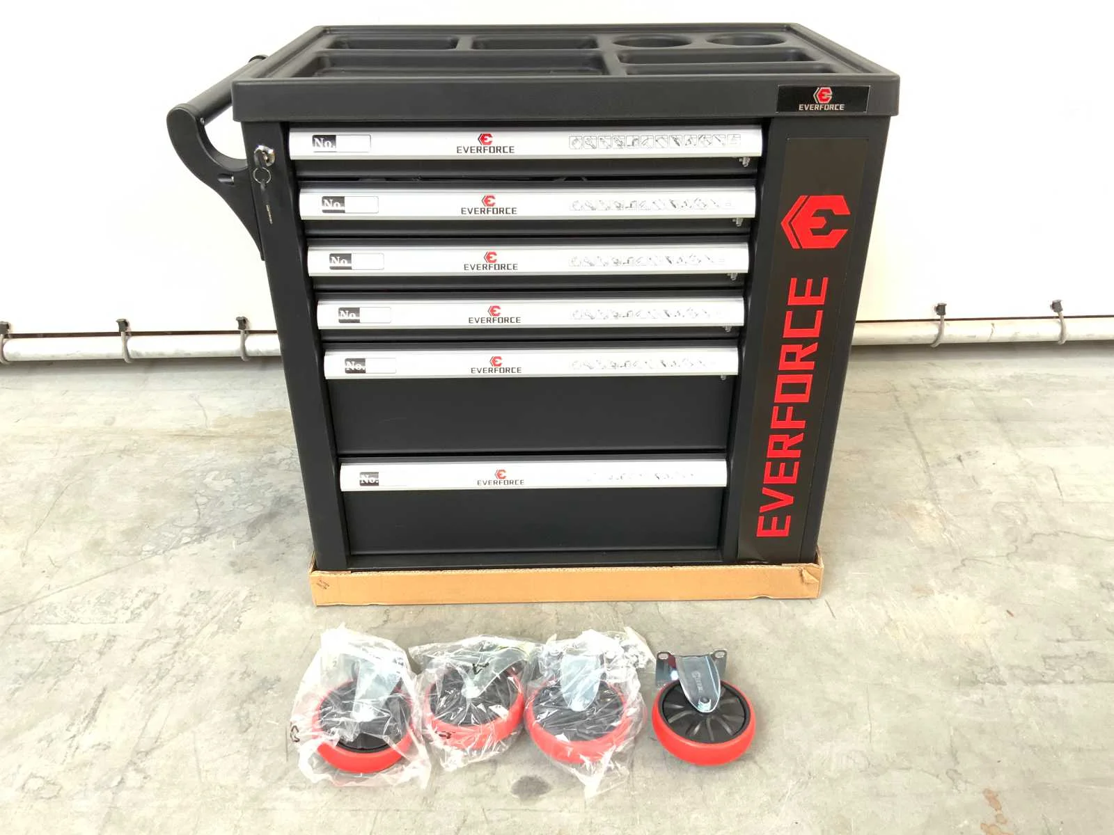 4 laden gevuld; verrijdbaar; afsluitbaar; lade 1 Doppenset 1/2” en 1/4” 4 tot en met 32 en toebehoren; Lade 2 steek ringsleutelset 8 tot en met 22 torx imbusset bitjes; lade 3 schroevendraaiers en imbusset; lade 4 tangen, hamer, pendrijvers; lade 4 & 5 zijn leeg voor opslag; 5769 Merk: Everforce Aantal laden: 6 Met inhoud: true Totale afmeting L: 840mm Totale afmeting Breedte: 460mm Totale afmeting Hoogte: 830mm