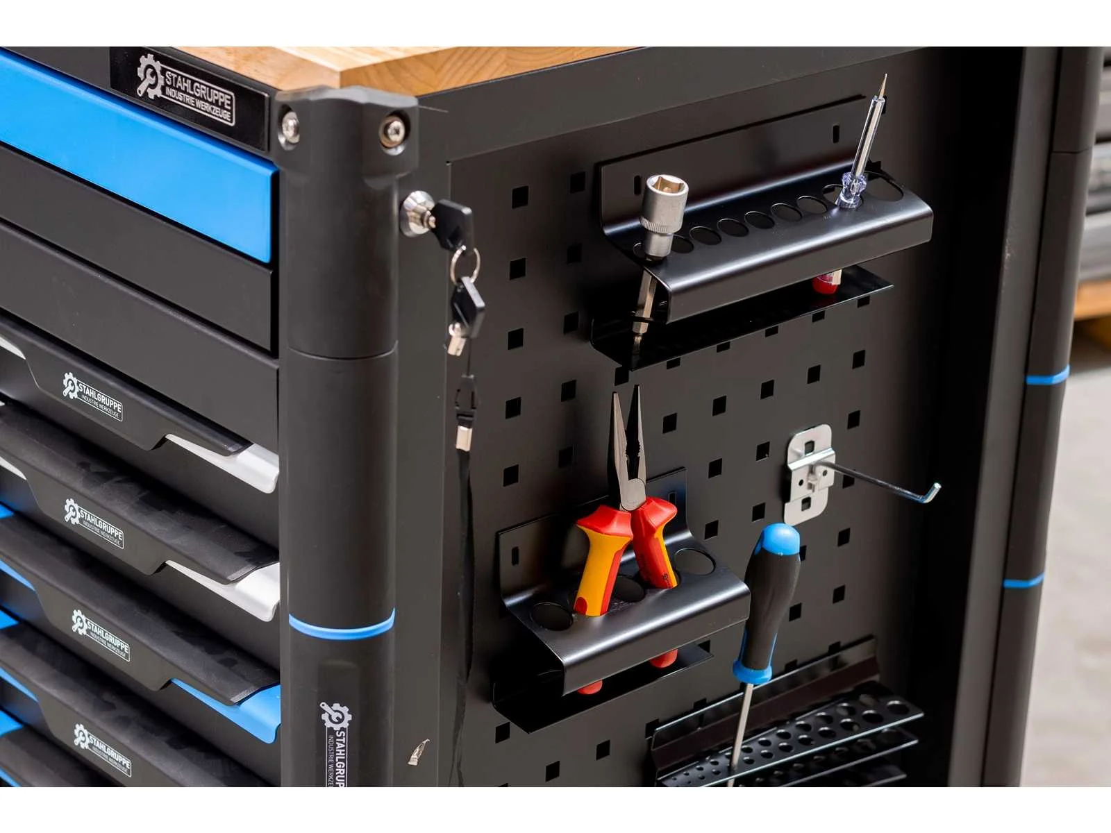 V.v. gereedschap 294-delig; 4 wielen waarvan 2 met rem; stuurgroep; houten werkblad; 13 lades; 11 lades gevuld; 2 sleutel sets; in de doos; ongebruikt; 4145; Merk: Stahlgruppe Type: SG22 Bouwjaar: 2023 Aantal laden: 13 Met inhoud: true Totale afmeting L: 1130mm Totale afmeting Breedte: 570mm Totale afmeting Hoogte: 1090mm
