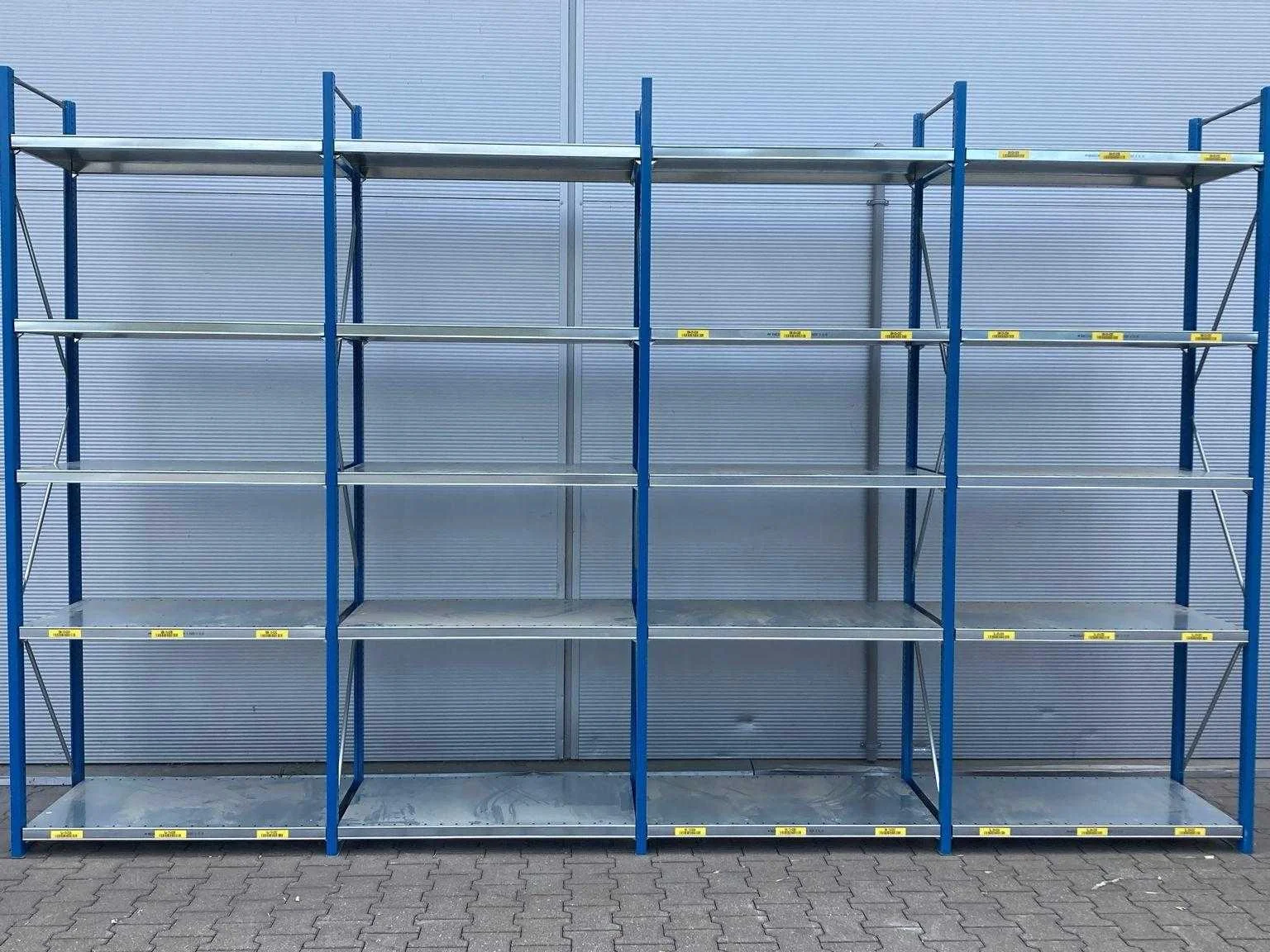 5x staander 2500x400mm; 20x legbord 970x400mm; gebundeld; gebruikt; 7691*5 / 7692*20 Merk: Nedcon Aantal secties: 4 Sectie afm. b: 970mm Sectie diepte: 400mm Sectie afm. h: 2500mm Aantal staanders: 5 Aantal legborden: 20 Demontabel: true