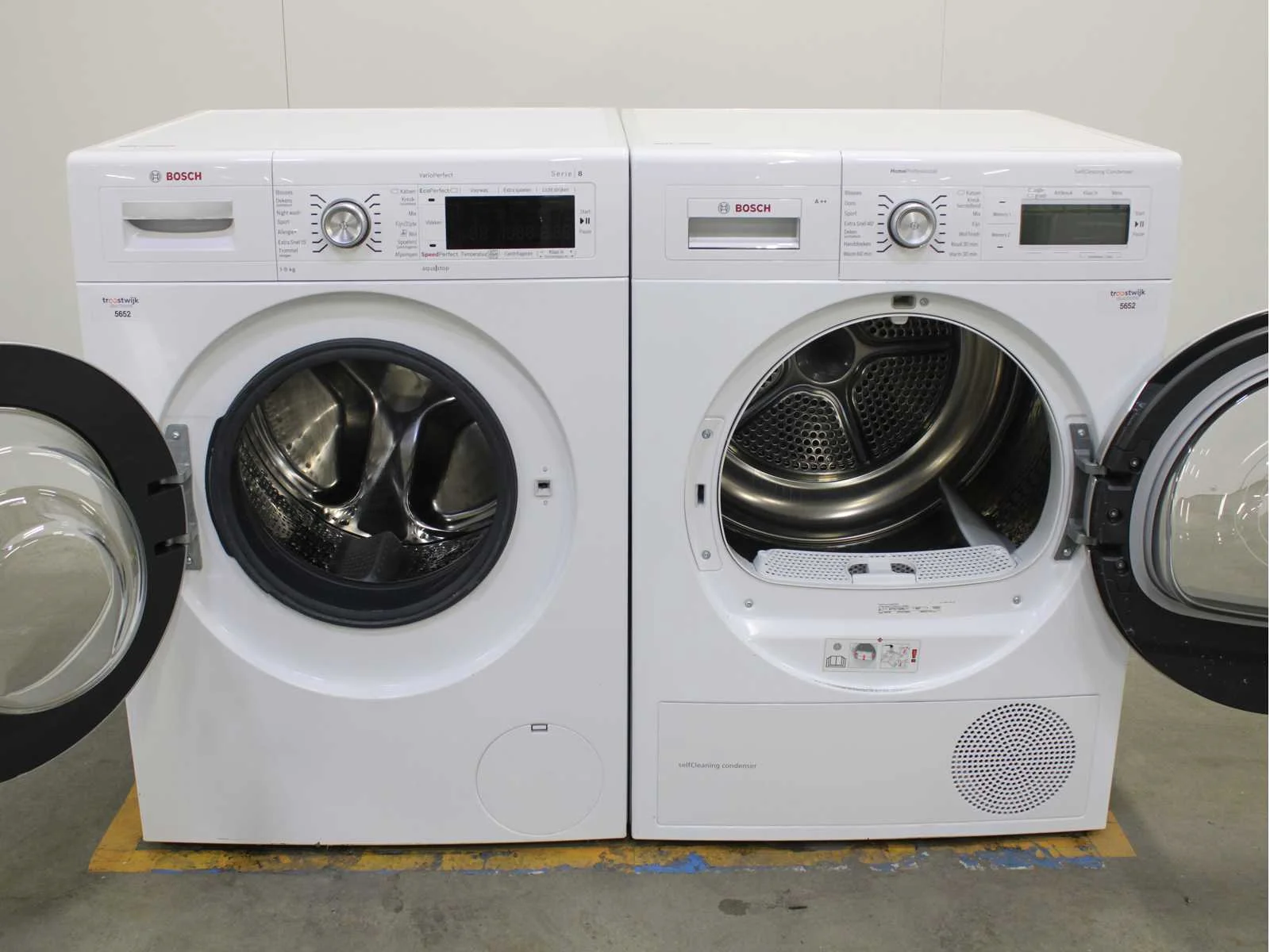 Deze wasmachine en wasdroger komen uit een partij jong gebruikt A-Merk witgoed. De machines zijn volledig getest, gereinigd en indien nodig gerepareerd. Houdt er rekening mee dat de machines lichte gebruikssporen kunnen hebben. Wasmachines en wasdrogers hebben vaak standaard afmetingen. Hoogte 85cm, Breedte 60cm en Diepte 60 tot 70cm, incl. uitstekende slangen e.d. aan de achterzijde. Als de machine vrij komt te staan is de afmeting minder relevant. Wil je de machine in een nis plaatsen of inbouwen? Controleer dan de exacte afmetingen op basis van het aangeboden merk en model/type. Within 7 days Merk: Bosch Serienummer: WAW32542NL en WTY87700NL