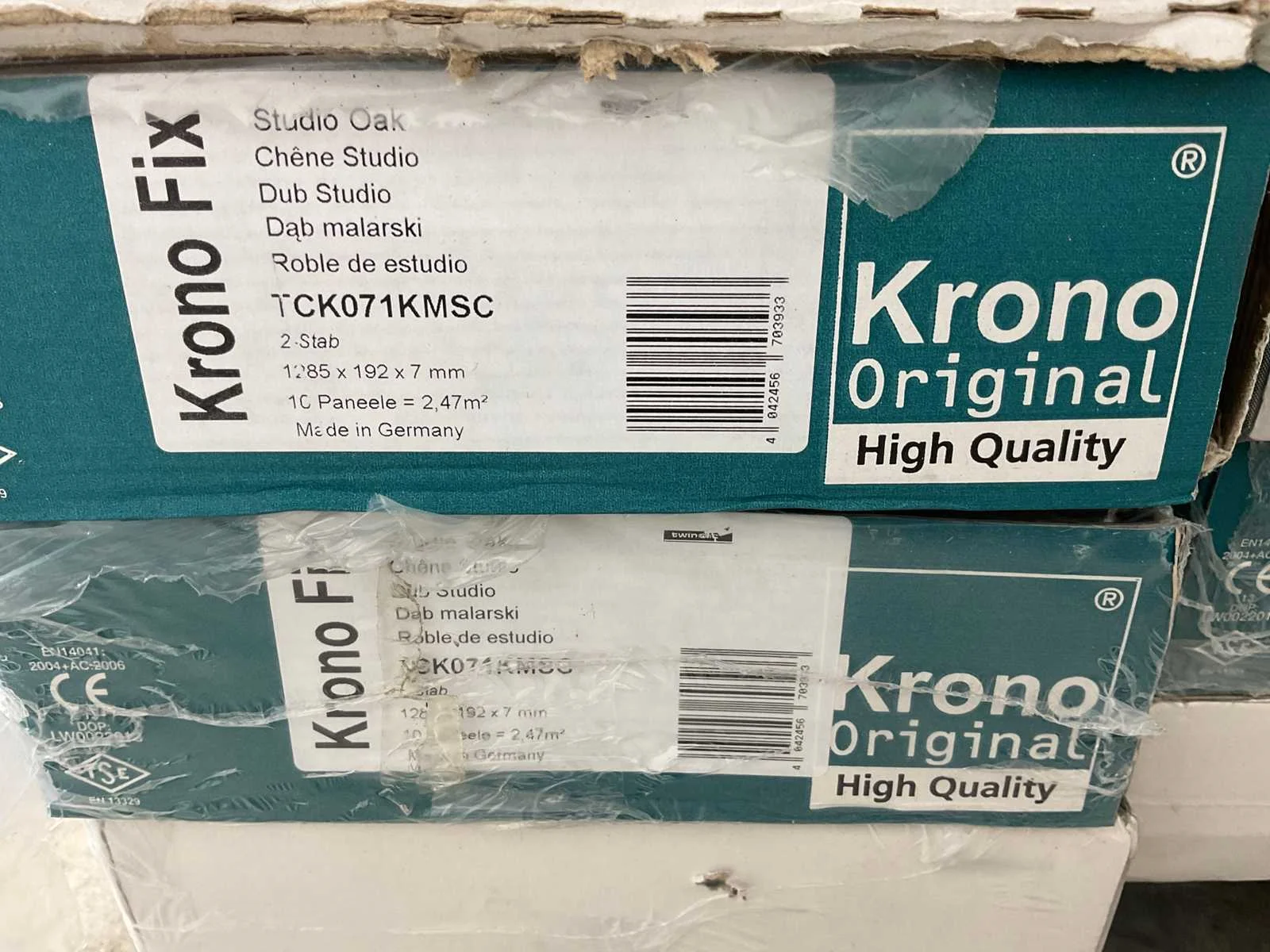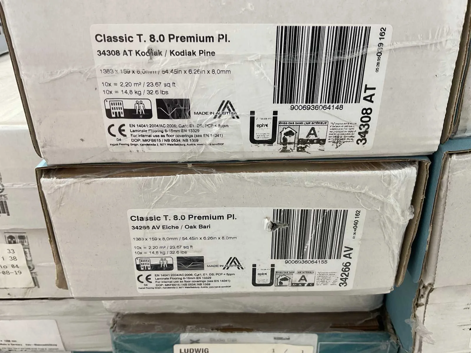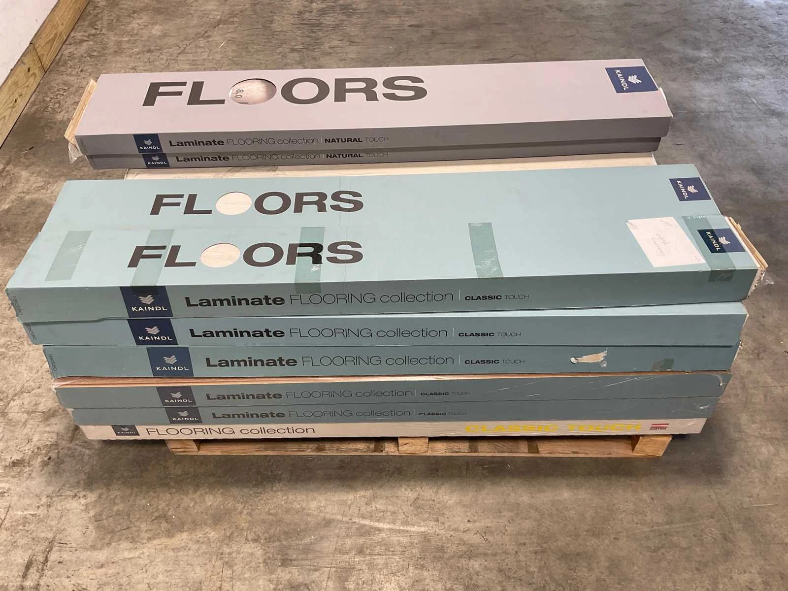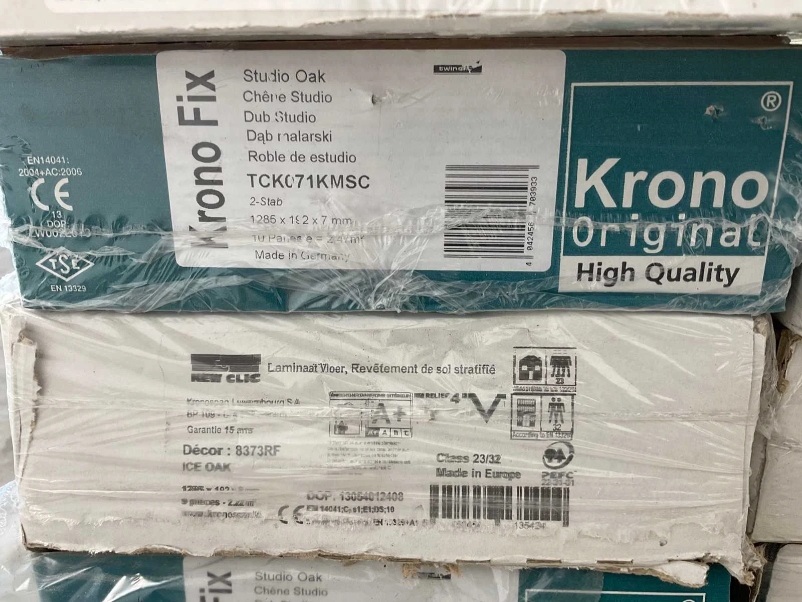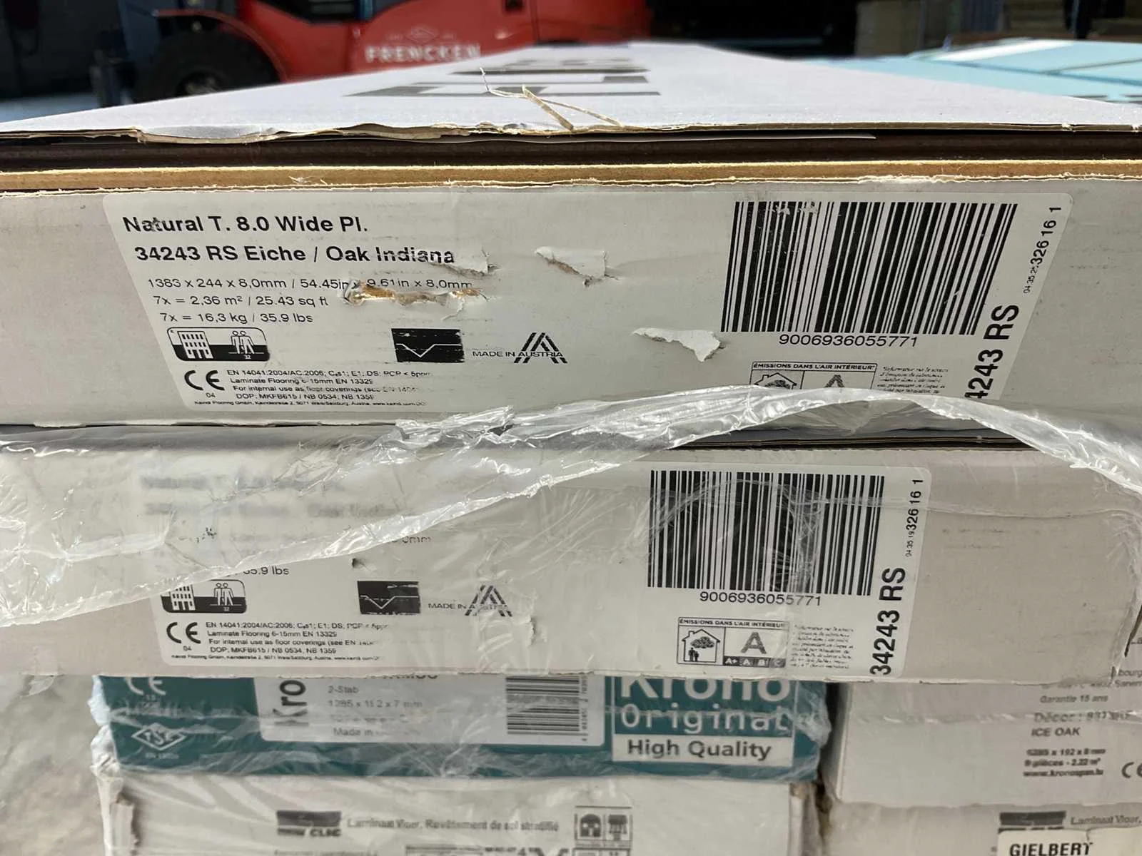 Mixpallet met diverse soorten laminaat – ongeveer 24 pakken, goed voor circa 49m². Bekijk de foto’s voor specificaties en details.