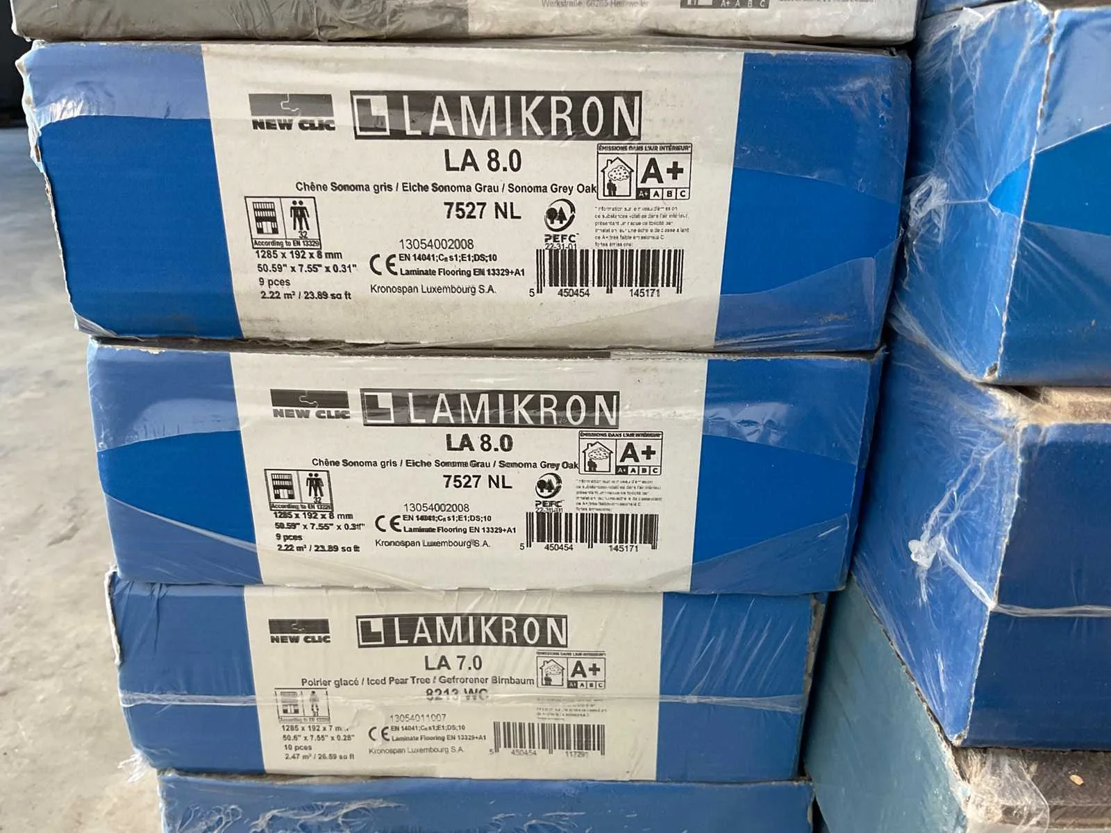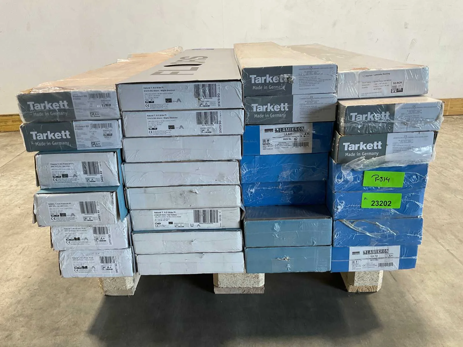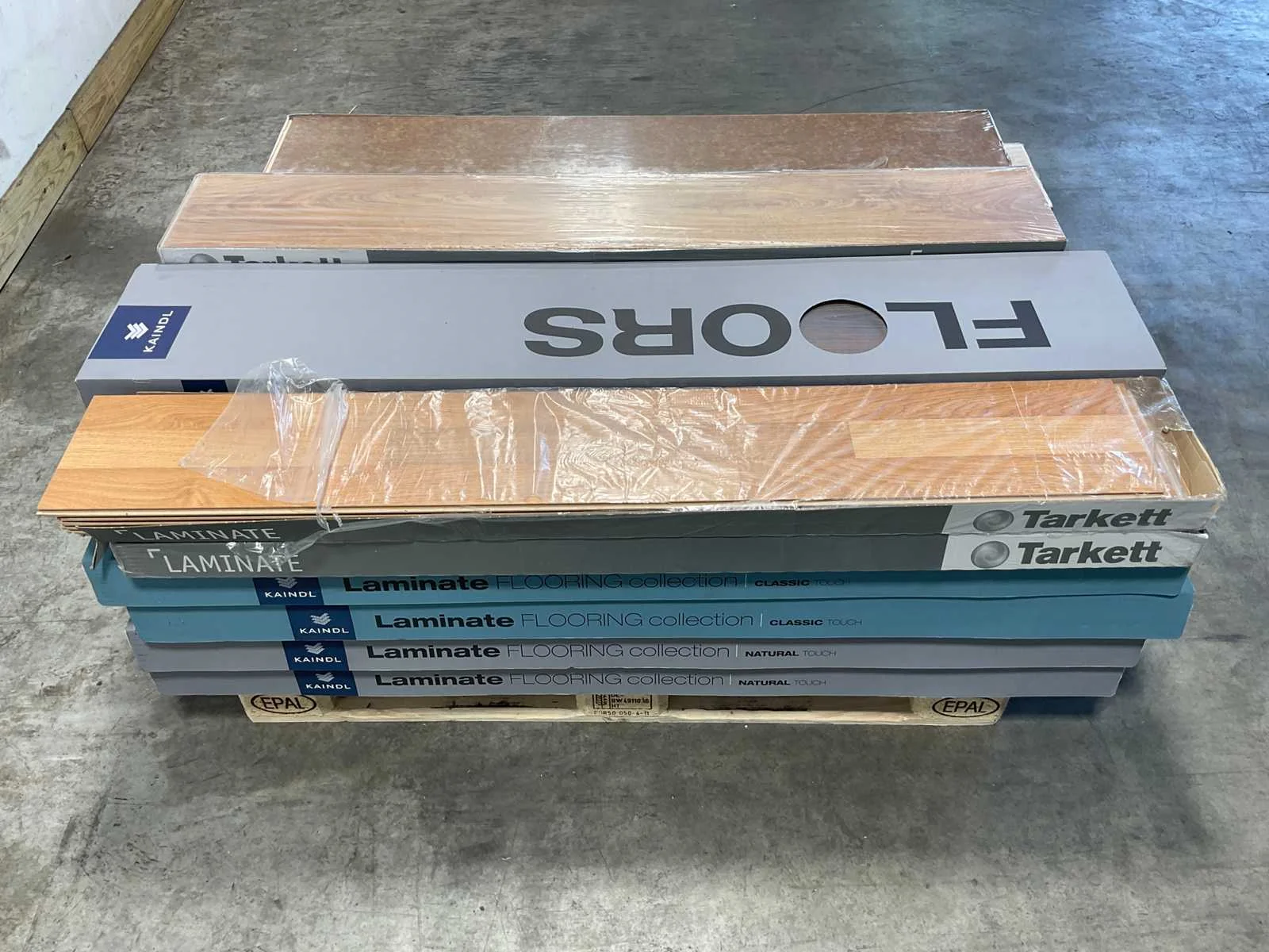 Mixpallet met diverse soorten laminaat – ongeveer 28 pakken, goed voor circa 62 m². Bekijk de foto’s voor specificaties en details.