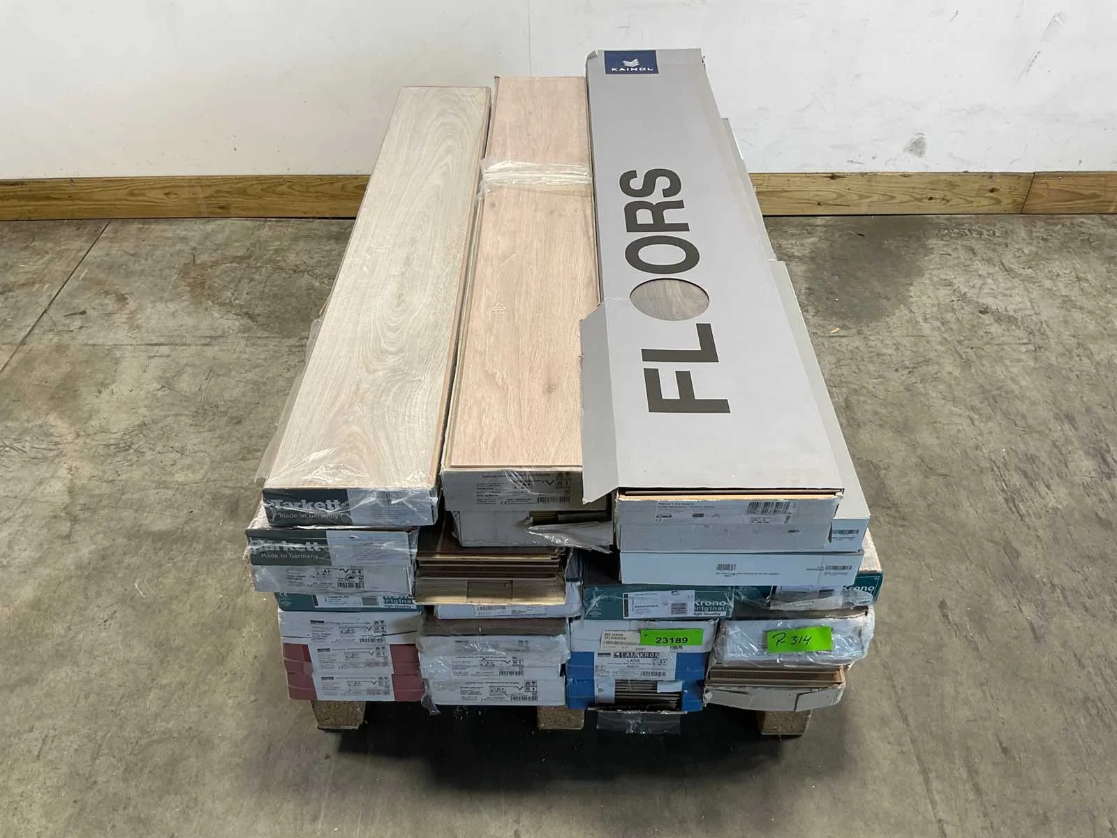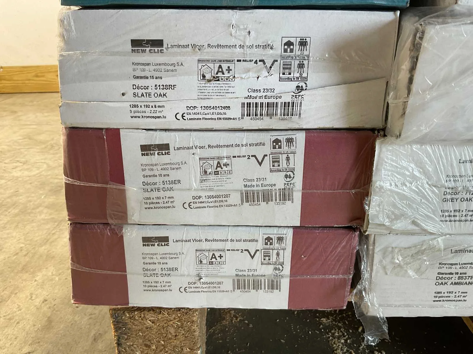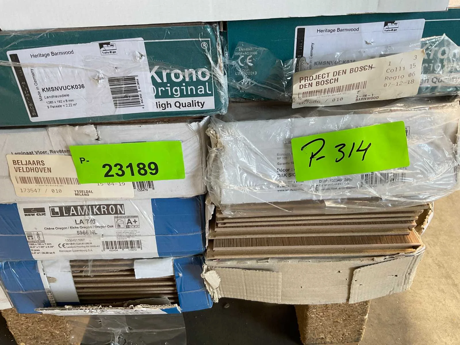 Mixpallet met diverse soorten laminaat – ongeveer 26 pakken, goed voor circa 57 m². Bekijk de foto’s voor specificaties en details.