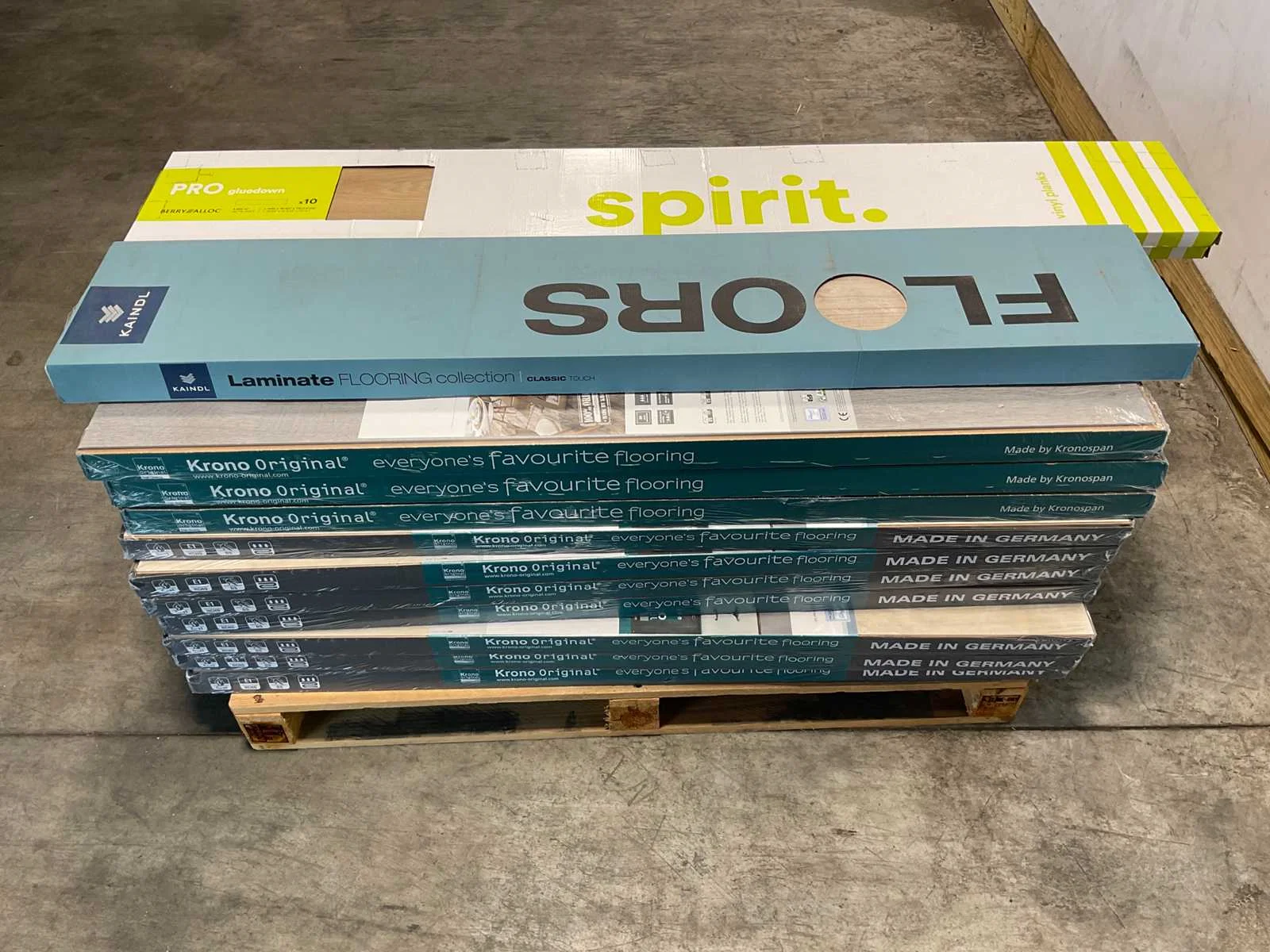 Mixpallet met diverse soorten laminaat – ongeveer 21 pakken, goed voor circa 50 m². Bekijk de foto’s voor specificaties en details.