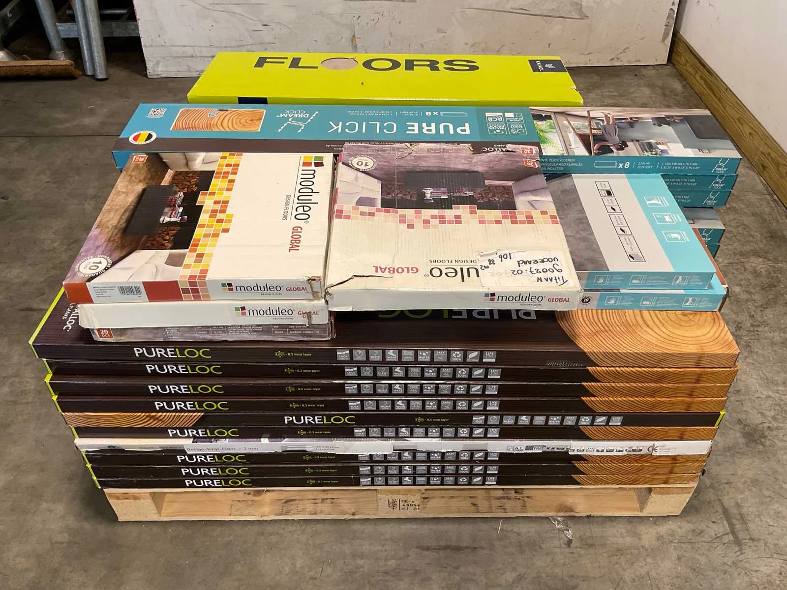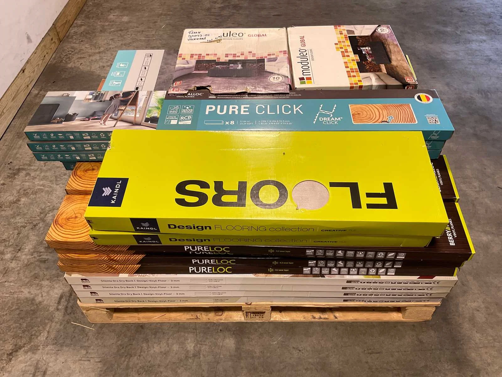 Mixpallet met diverse soorten laminaat – ongeveer 53 pakken, goed voor circa 115 m². Bekijk de foto’s voor specificaties en details.