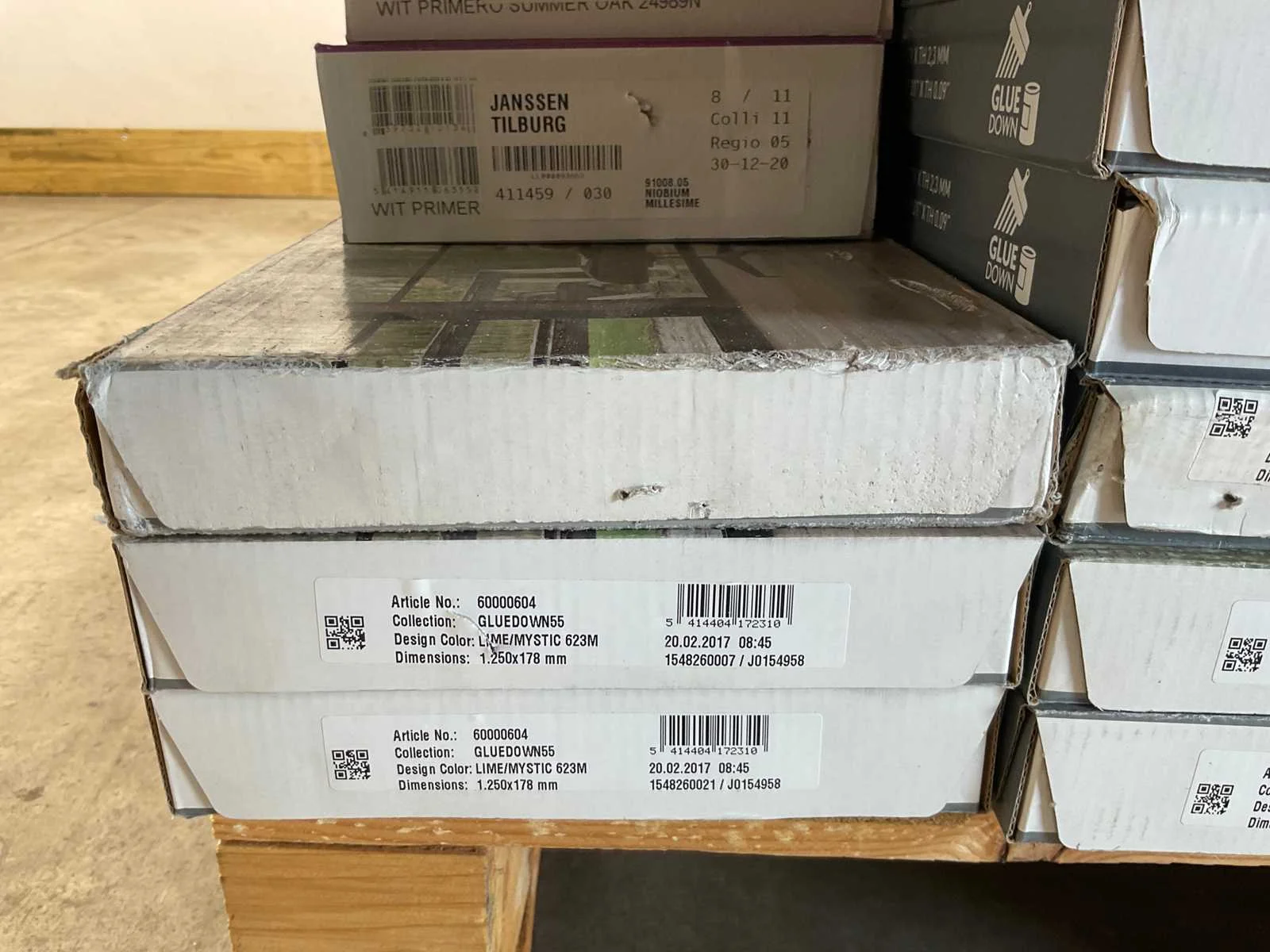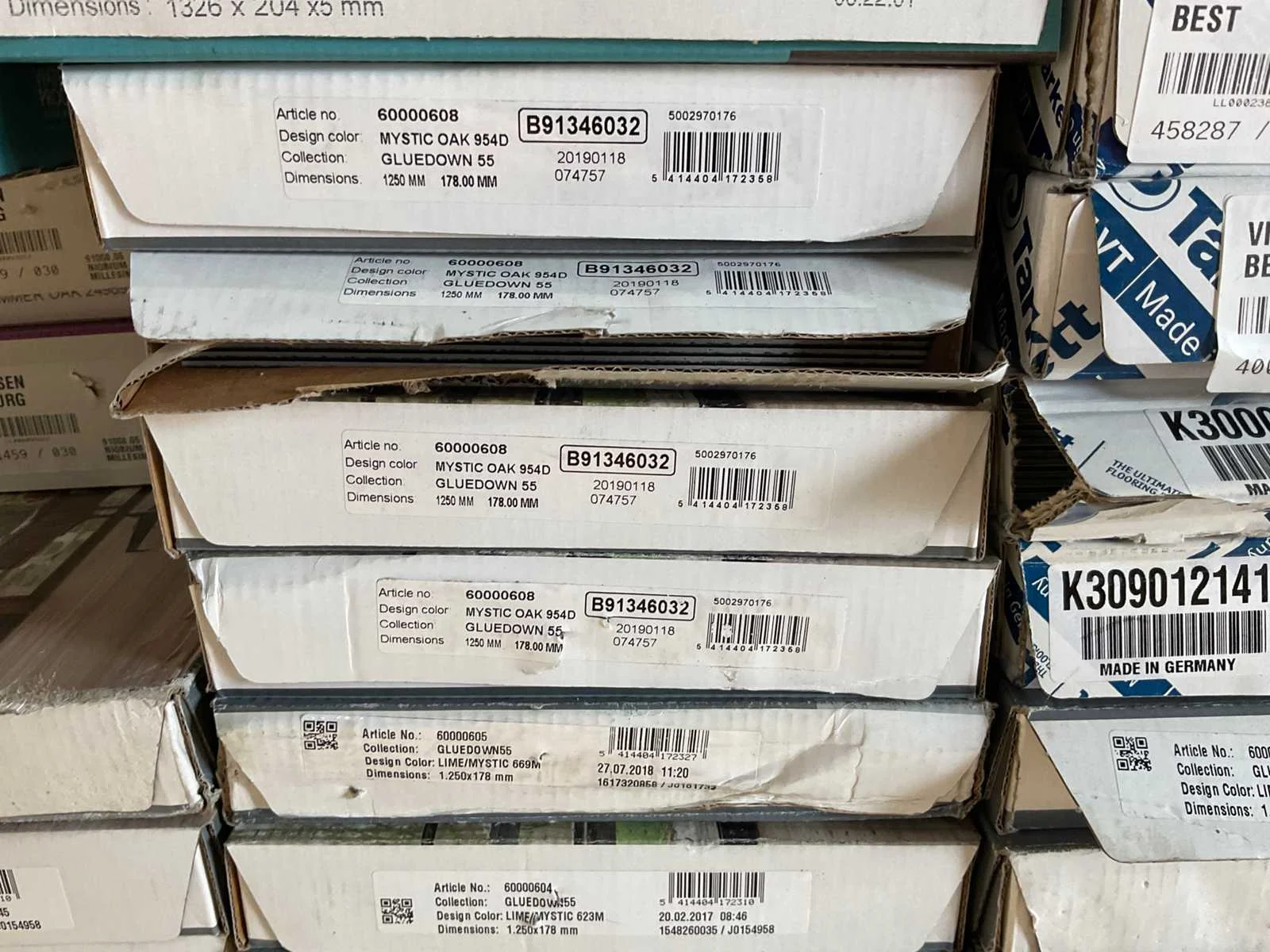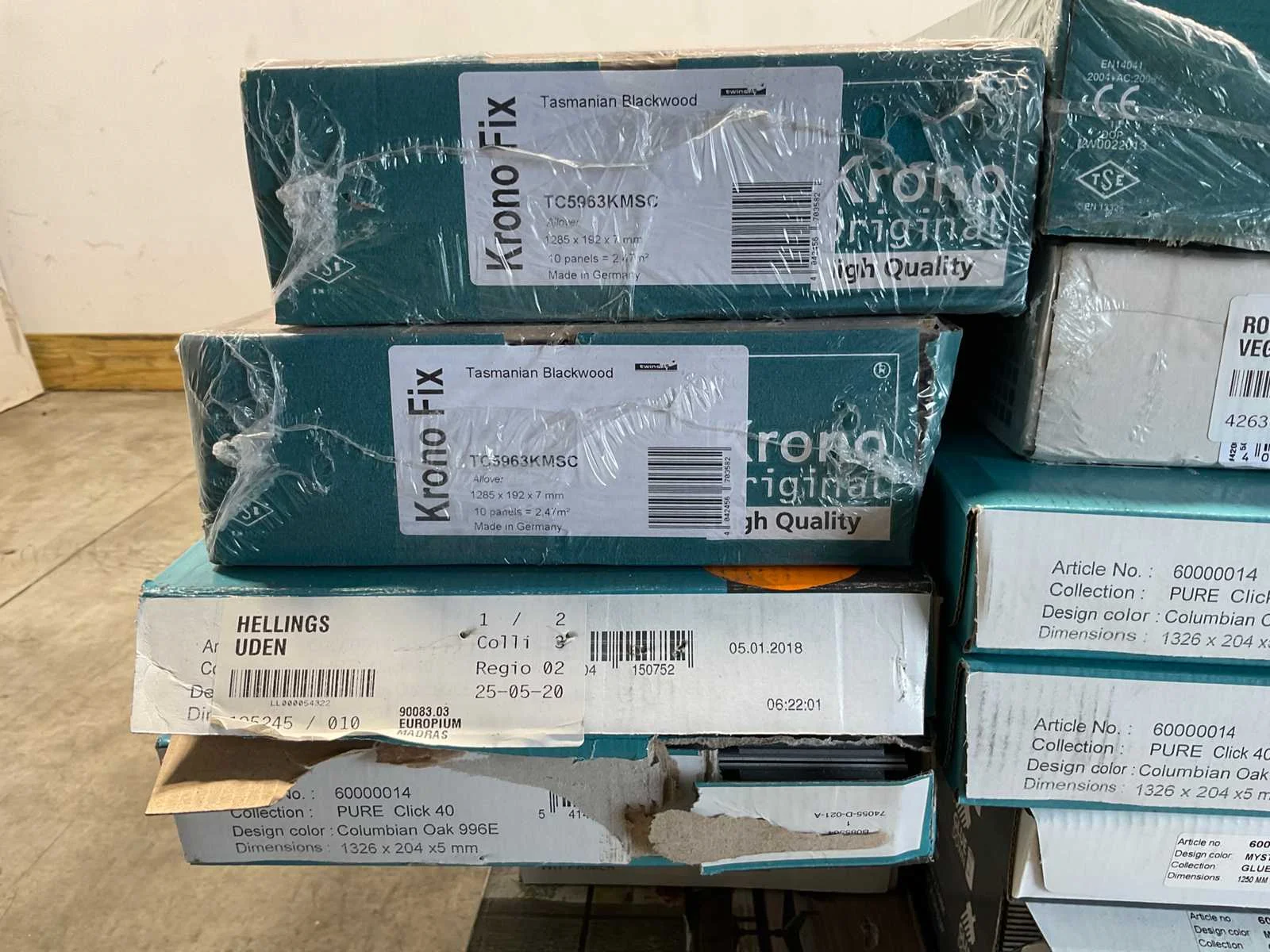 Mixpallet met diverse soorten laminaat – ongeveer 39 pakken, goed voor circa 85 m². Bekijk de foto’s voor specificaties en details.