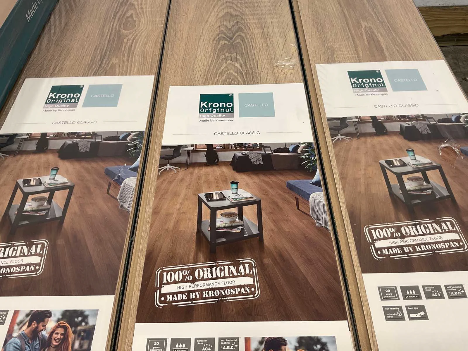 Kliklaminaat – 2,22 m² per pak. Inhoud per pak: 9 planken van 1285 × 192 × 8 mm. https://pennyshop.ba/shop/proizvod/krono-orginal-laminat-ac4-8072/141003 https://www.webba.hu/Laminalt-parketta-8-mm-Krono-Original-Castello-807 Merk: Krono Model: Castello Product type: kliklaminaat V-groef: true Aantal m² per verpakking: 2.22m² Kleur: Nostalgic Oak Lengte: 1285mm Breedte: 192mm Hoogte: 8mm