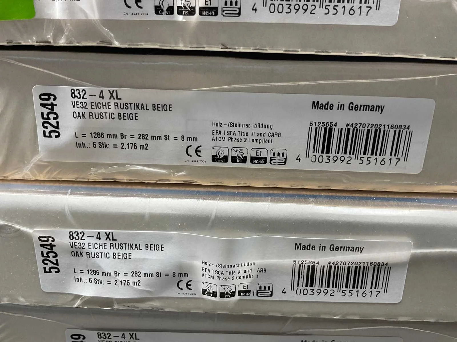 Kliklaminaat – 2,176 m² per pak. Inhoud per pak: 6 planken van 1286 × 282 × 8 mm. https://www.parkettkaiser.de/eu-en/classen-laminat-832-4-xl-eiche-rustikal-beige-1-stab-landhausdiele-4v.html https://www.bauhaus.dk/laminatgulv-xl-oak-ructic-beige-1286x282x8-mm-2-176-m2?srsltid=AfmBOopUDfH3ZW9blfCIaS9gX7L16j9isd4sb8MtPlj8jSJdf5kMeh-Z https://www.parkettkaiser.de/de-de/classen-laminat-832-4-xl-eiche-rustikal-beige-1-stab-landhausdiele-4v.html Model: 832XL-4 Product type: kliklaminaat V-groef: true Aantal m² per verpakking: 2.176m² Kleur: Oak Rustic Beige Lengte: 1286mm Breedte: 282mm Hoogte: 8mm