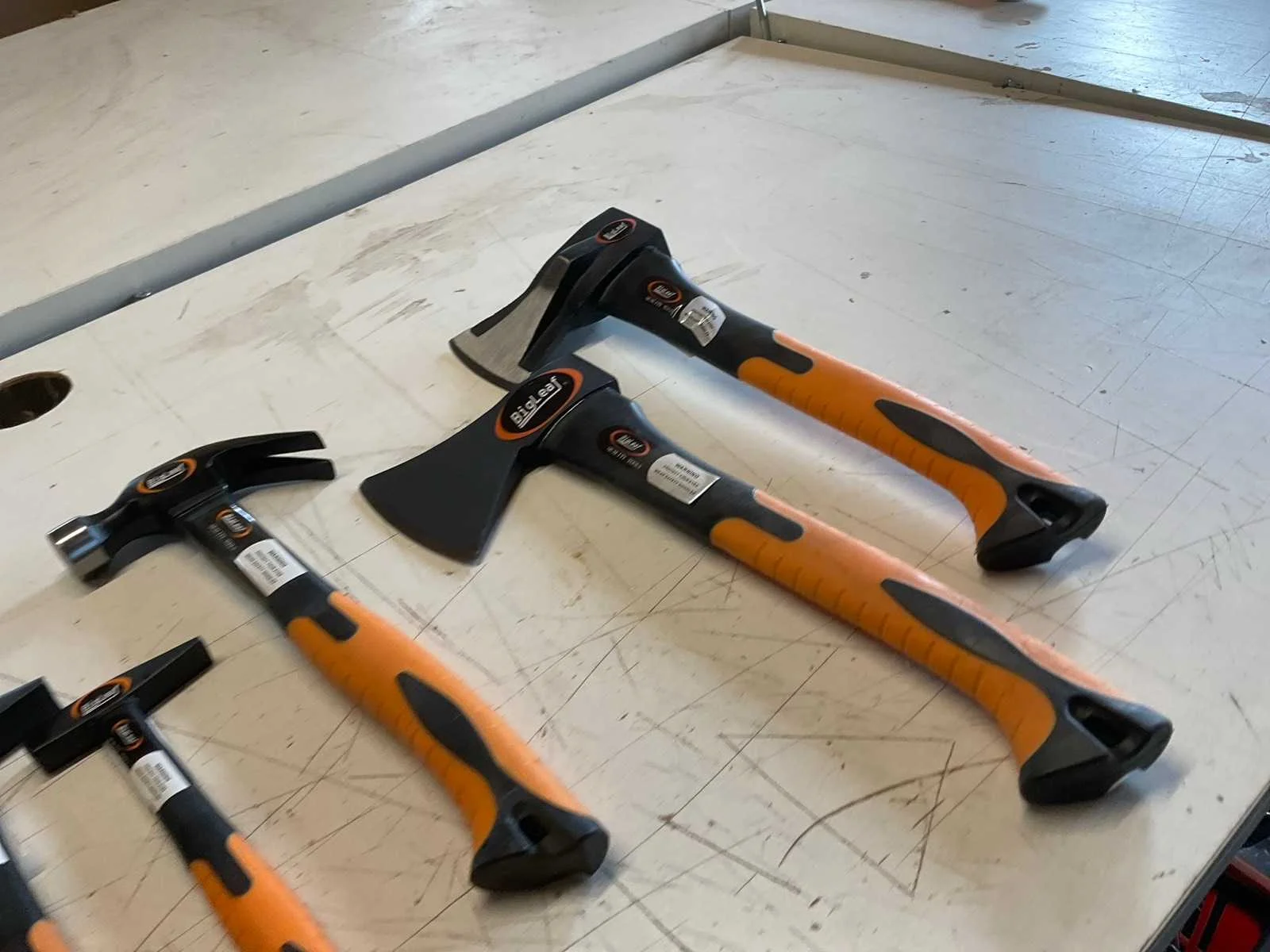 1 rubber, 1 hamer, 1 vuisthamer, 4 bankhamers, 1 klauwhamer, 1 bijl, 1 kloofbijl. Zie foto's voor details. Merk: Big Leah