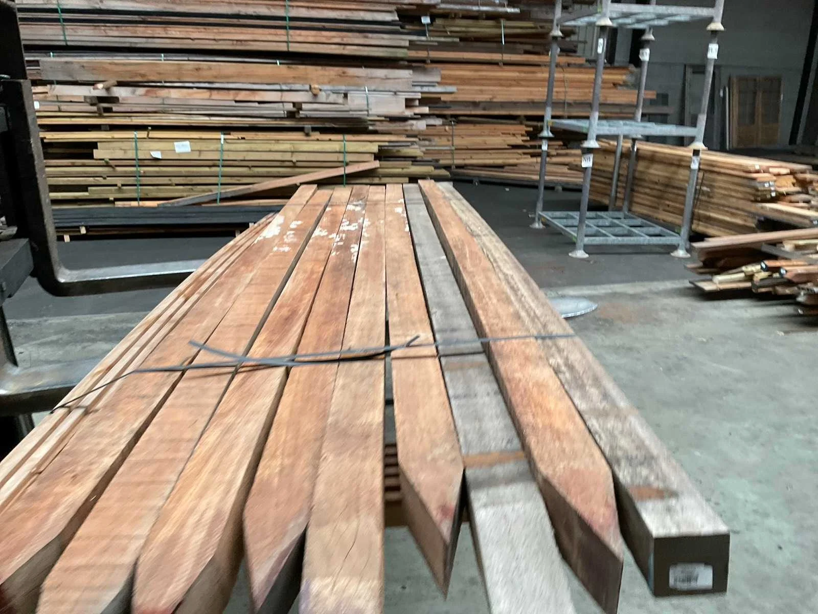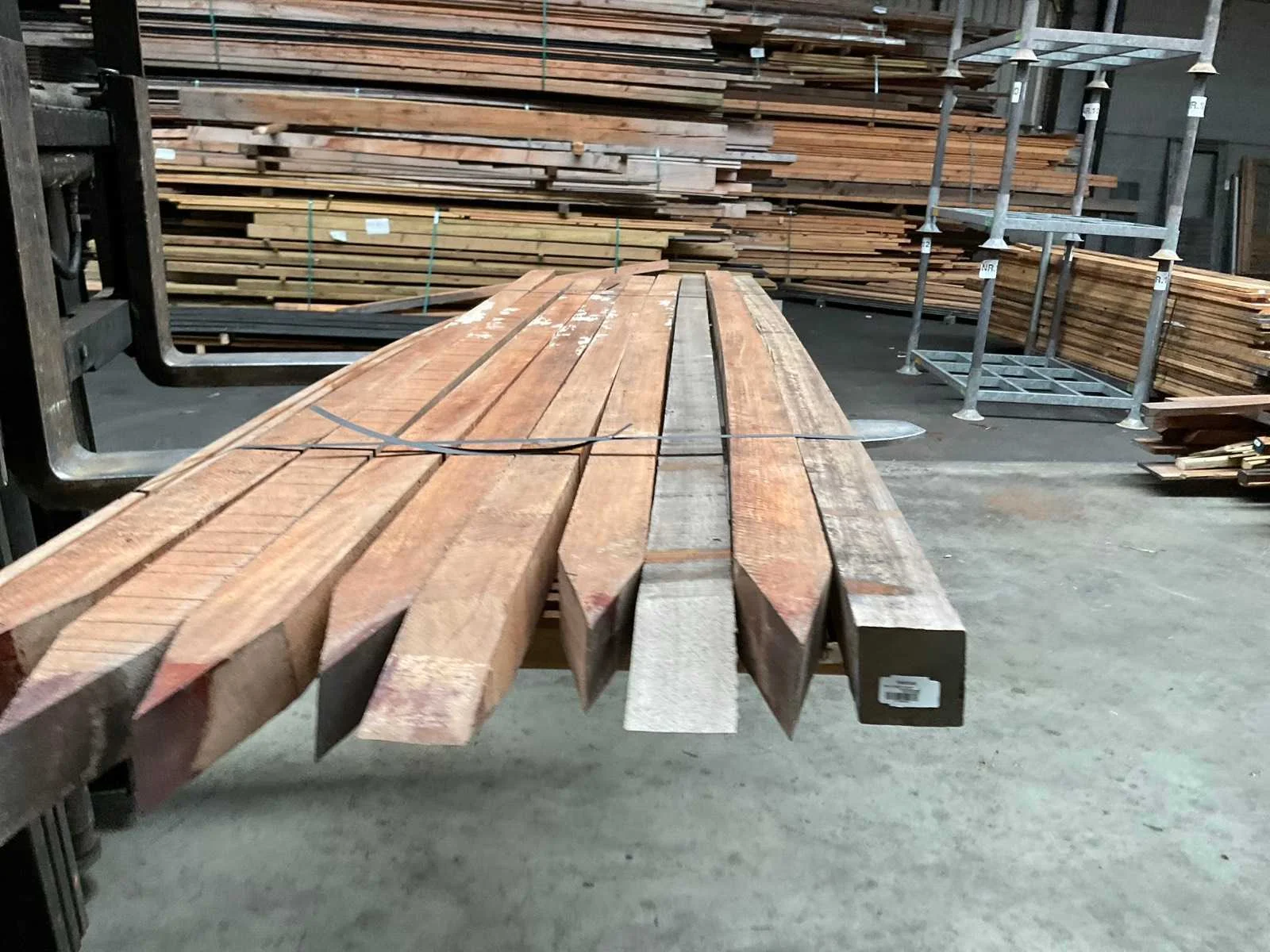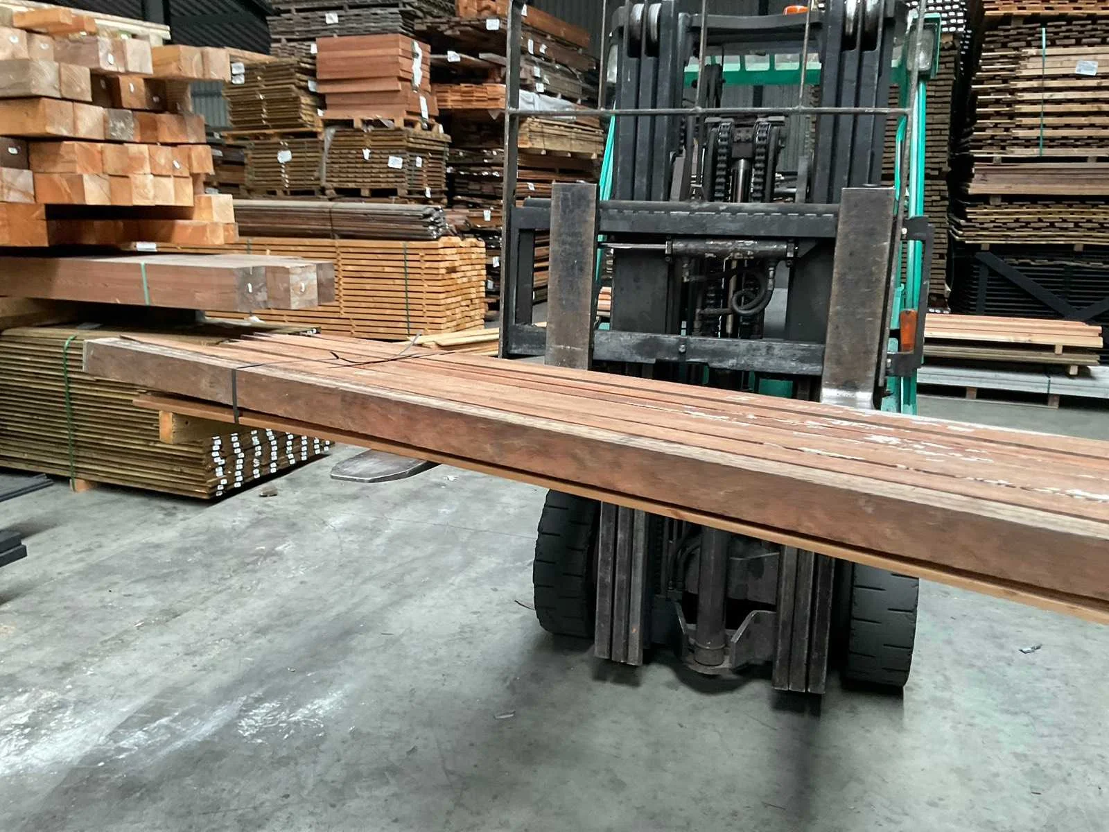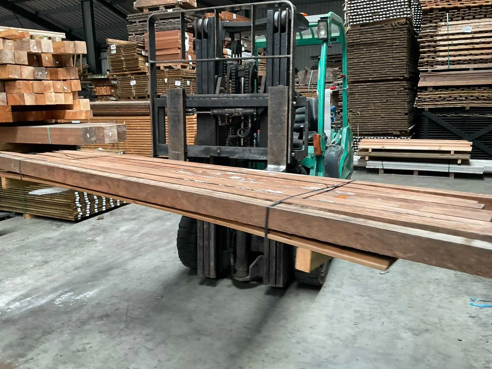Let op: Retour goed. Zie foto's voor details. Houtsoort: Azobé Materiaal: Hardhout Kopmaat: 70x70 Gewicht: 125kg Totale afmeting Breedte: 2700mm