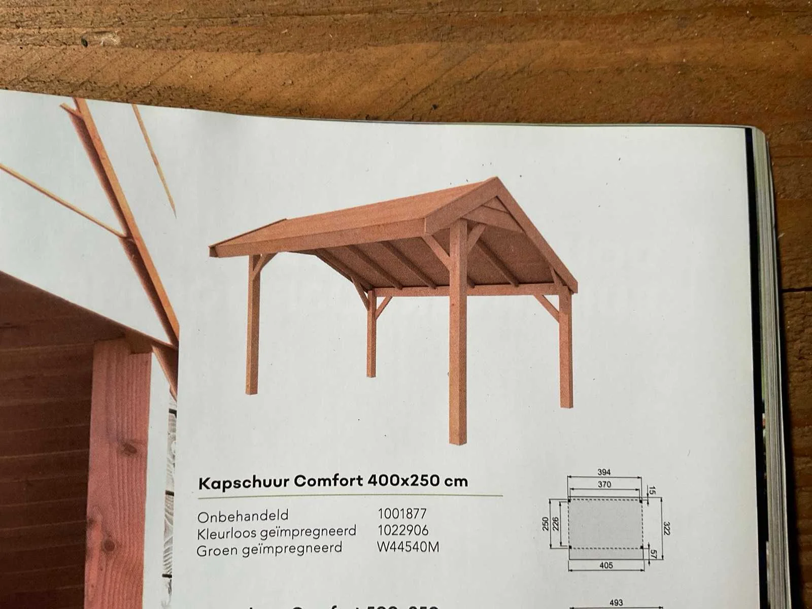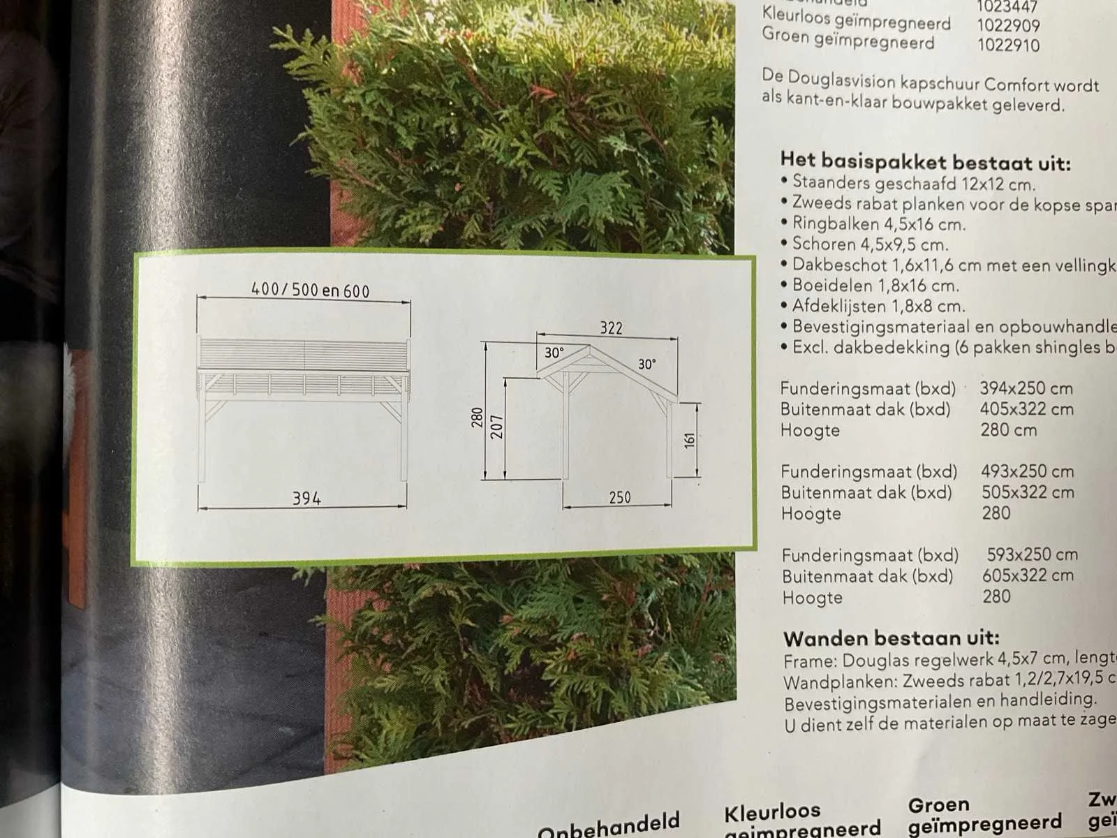 Inclusief de handleiding. Merk: Woodvision Model: Kapschuur Product type: Comfort Gewicht: 400kg Lengte: 250cm Breedte: 400cm Hoogte: 280cm Materiaal: Douglas geimperneerd