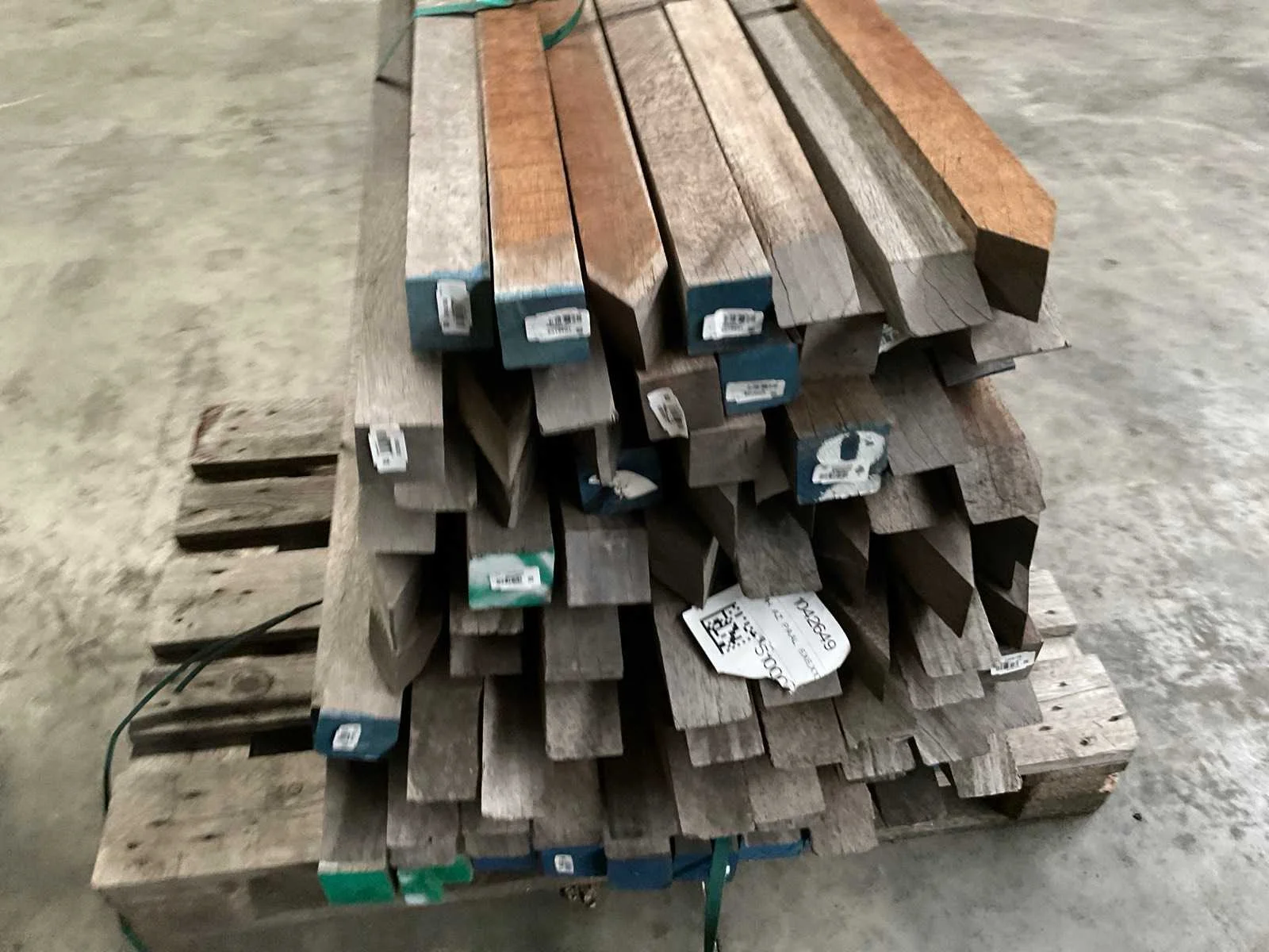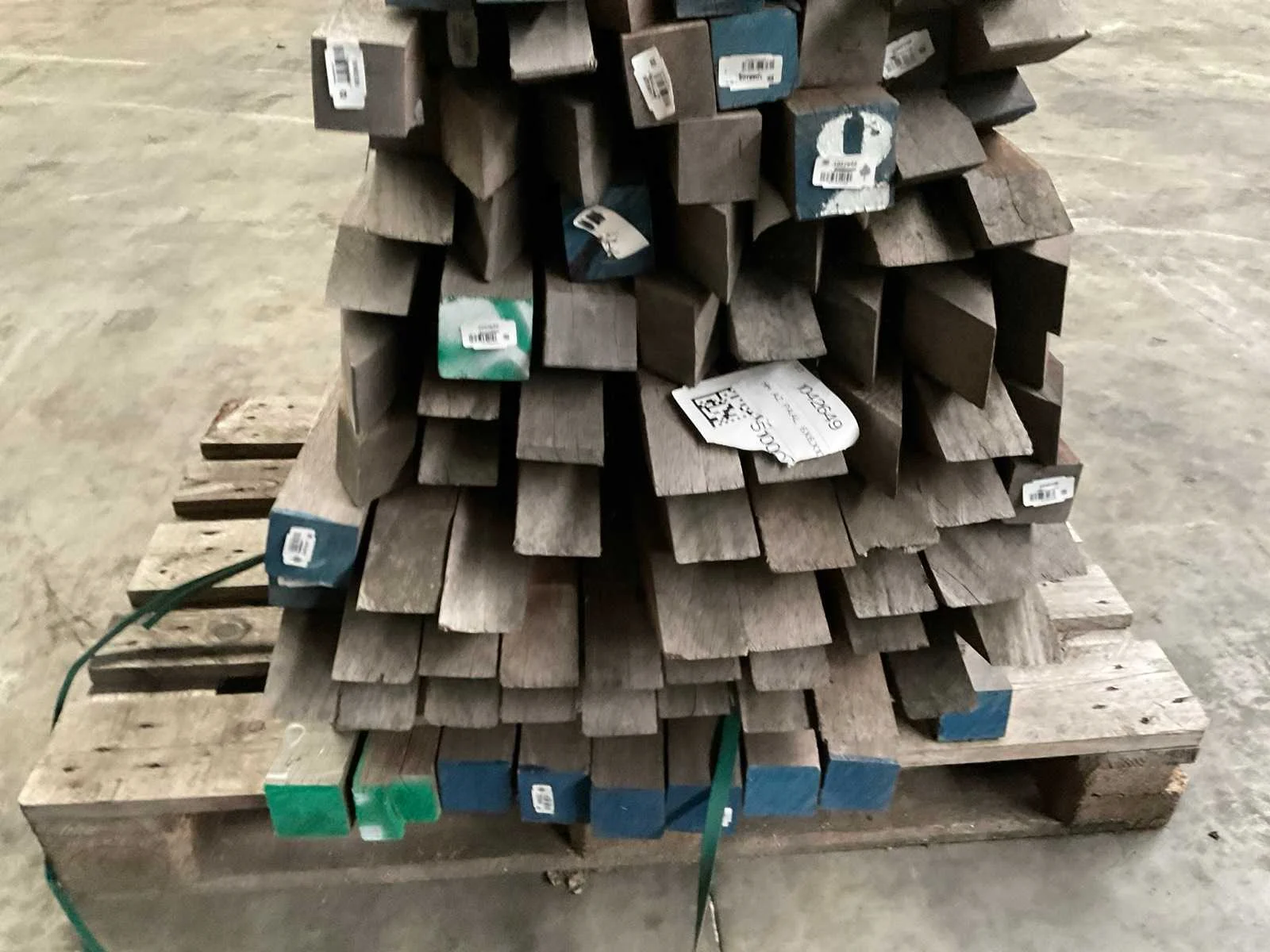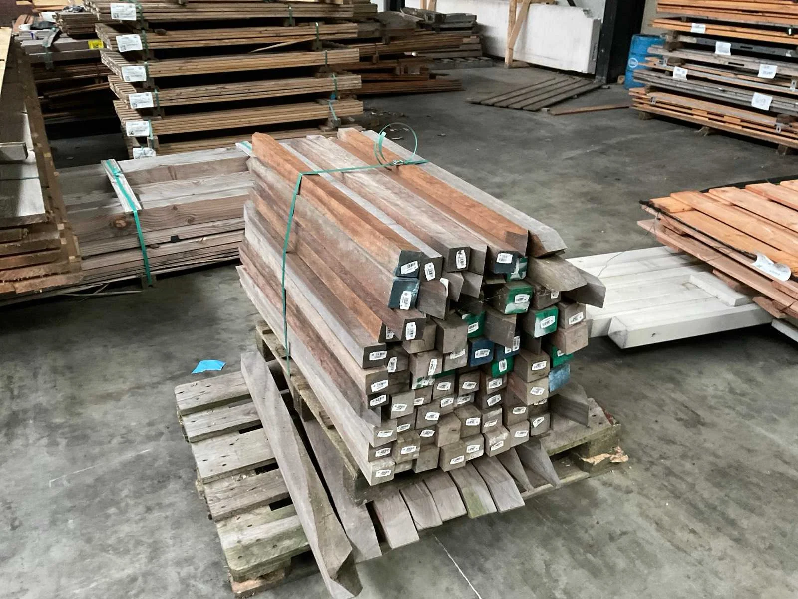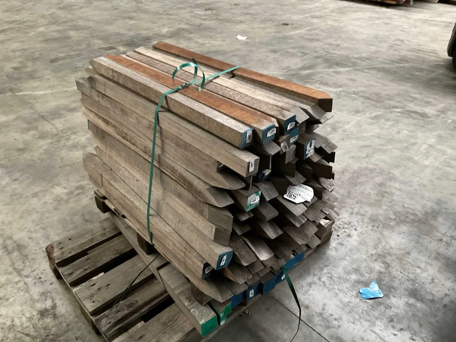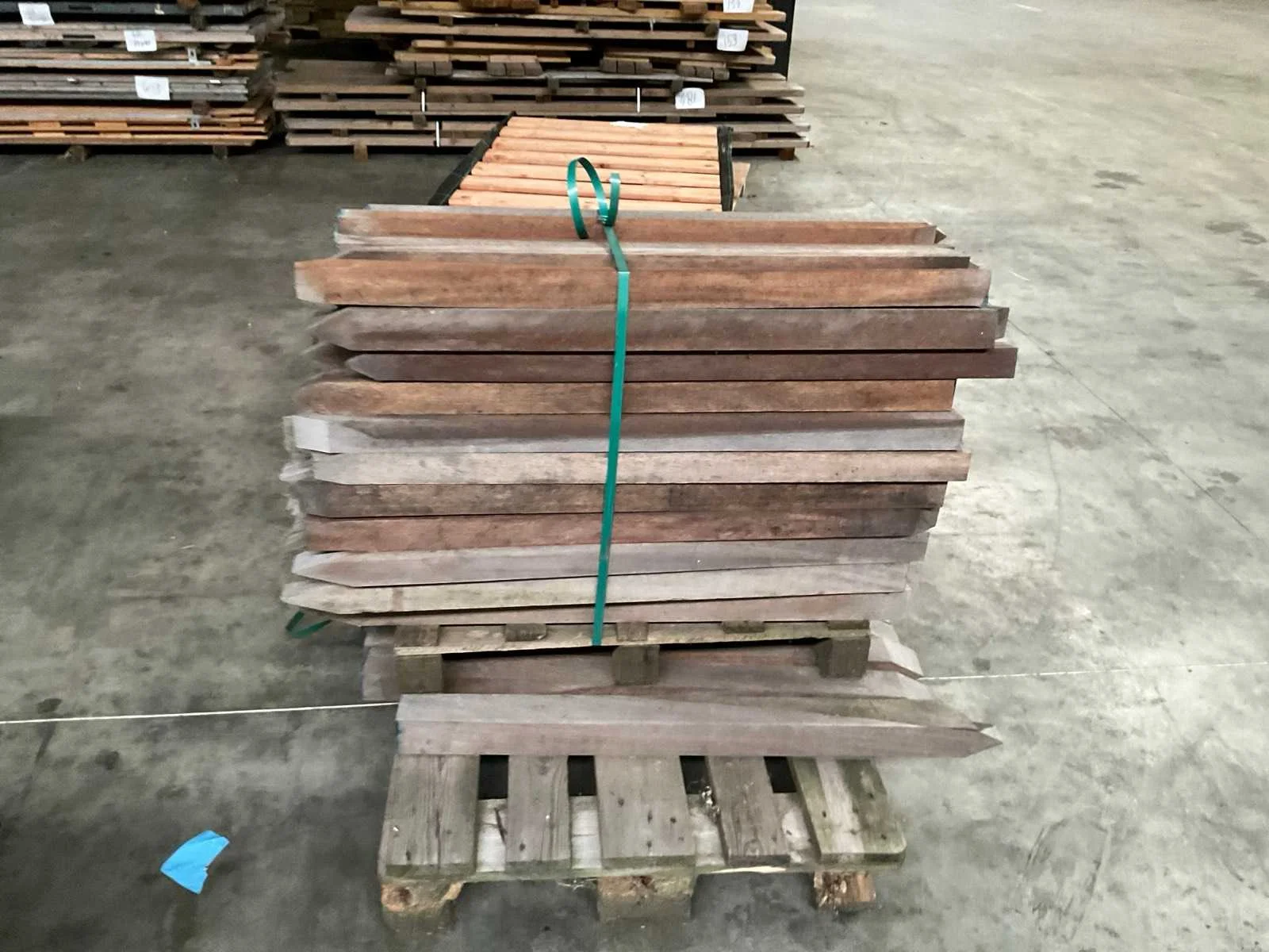 Partij Azobé hardhouten tuinpalen gepunt. Lengte 100 cm, diverse kopmaten 50x50-60x60-70x70. Zie de foto's voor details Houtsoort: Azobé Materiaal: Hardhout Hoogte: 1000mm Kopmaat: 50x50-60x60-70x70 Gewicht: 300kg