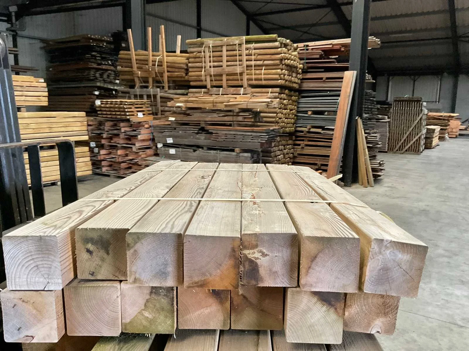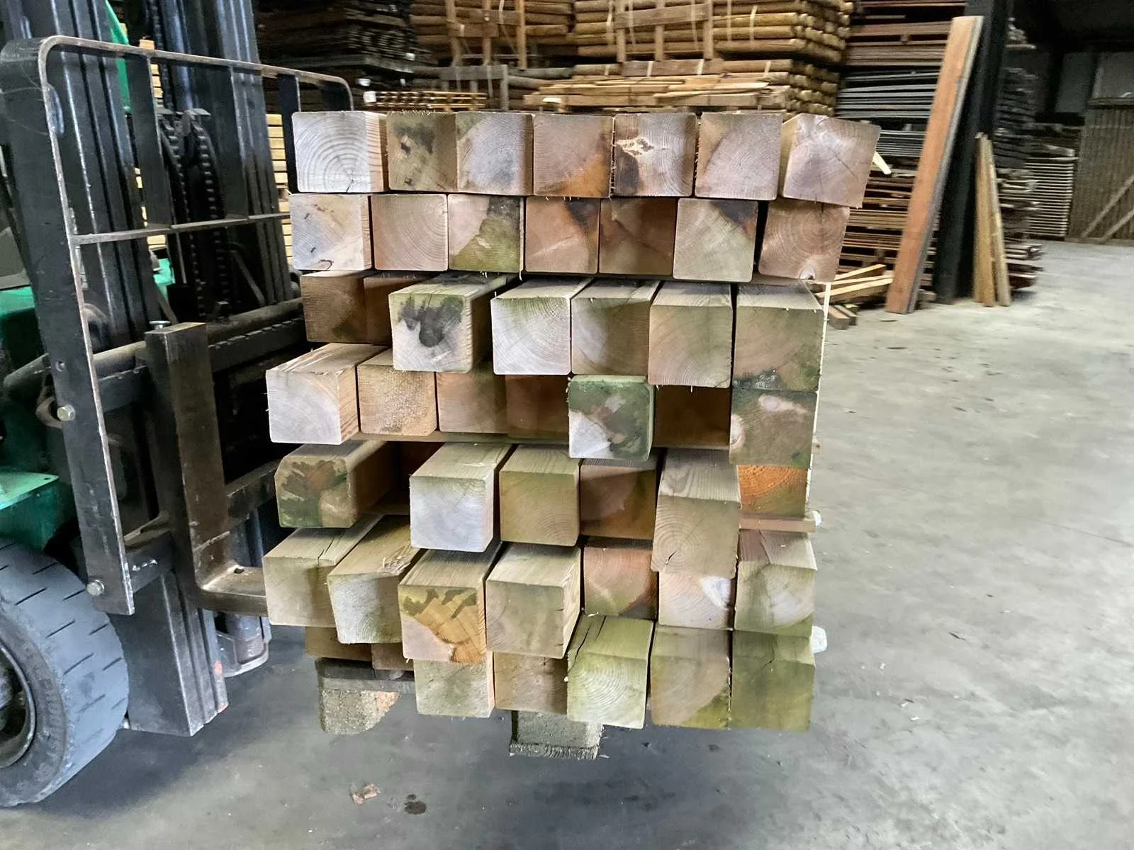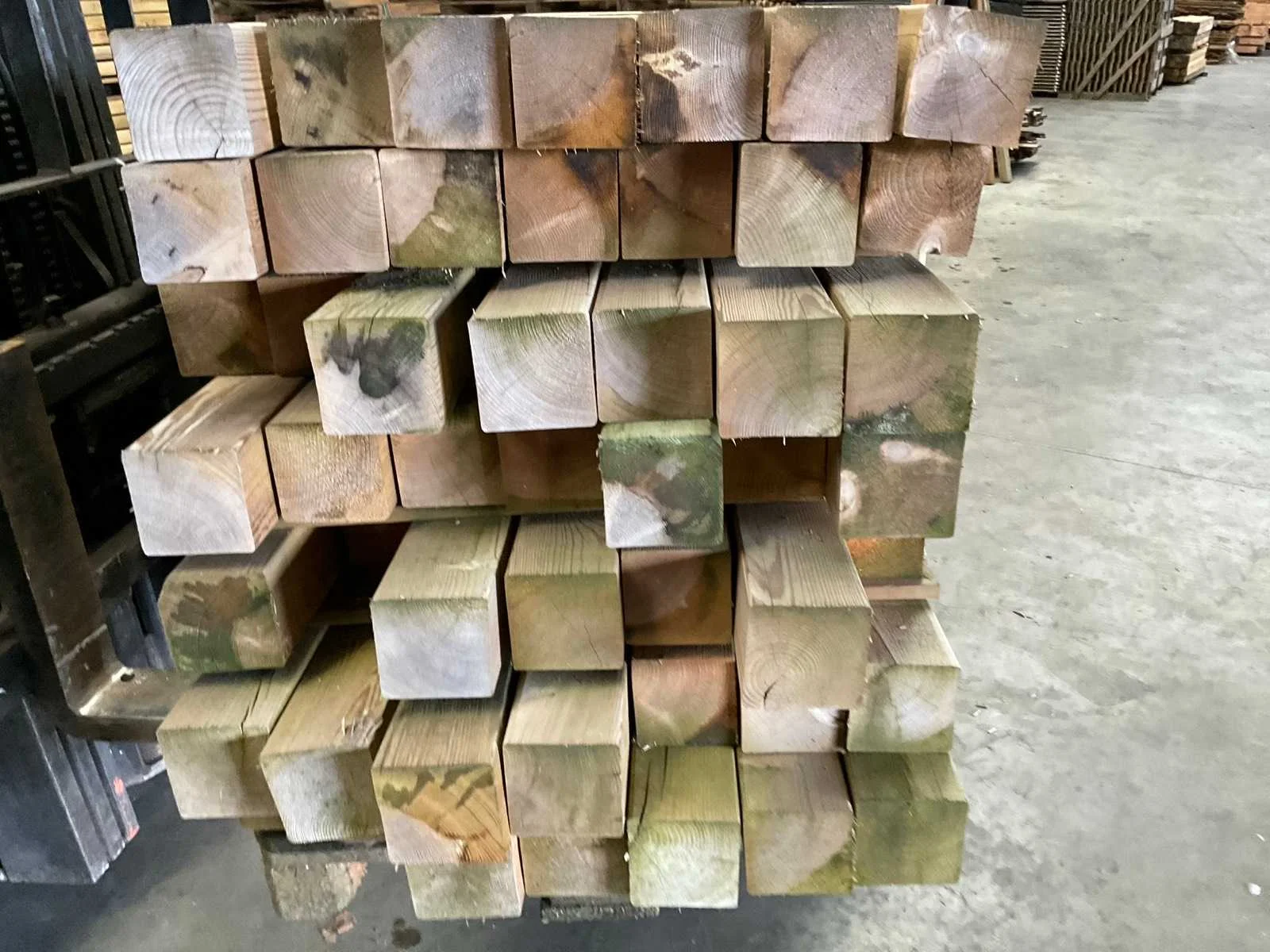 Partij grenen geïmpregneerde balken 120-140x11,5x11,5 cm. Bestaat uit diverse lengtes 120-140cm. Zie foto's voor details. Houtsoort: Grenenhout geimperneerd Lengte: 120-140cm Breedte: 115mm Hoogte: 115mm Kopmaat: 115x115mm Gewicht: 300kg