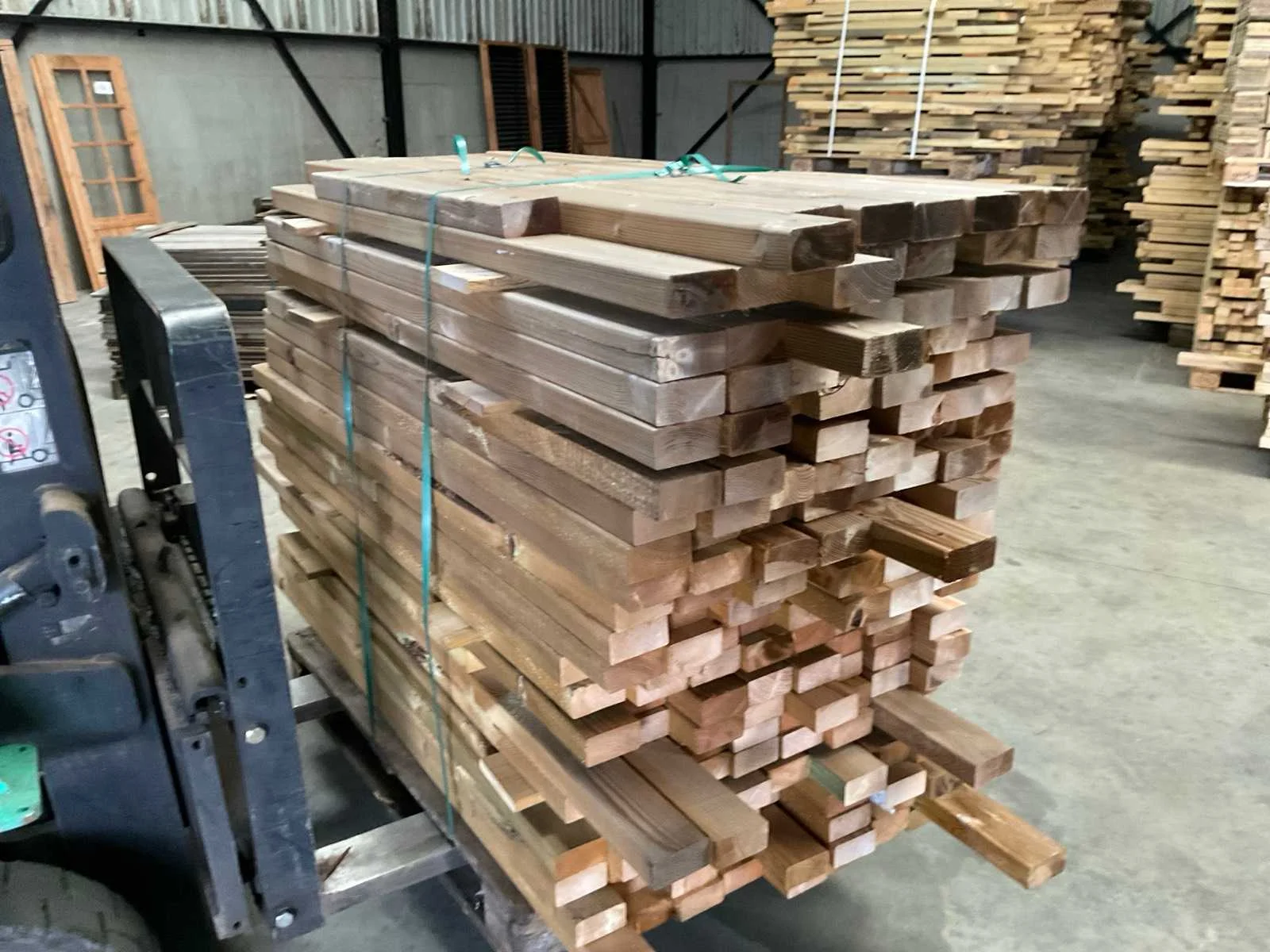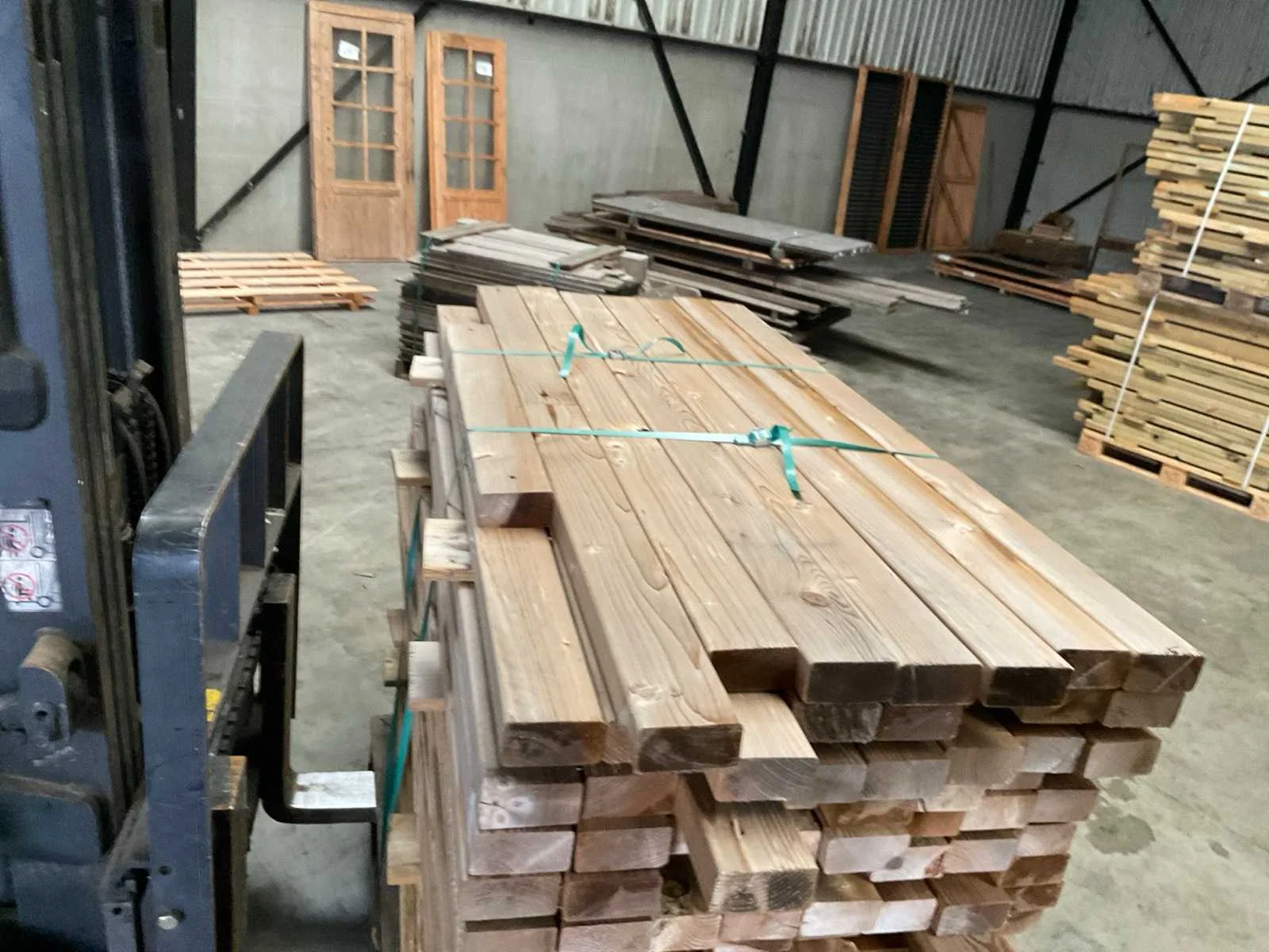 Partij grenen geïmpregneerde balken 80-150x9x4,5 cm. Bestaat uit diverse lengtes 80-150cm, in totaal ca. 250 lopende meter. Zie foto's voor details. Houtsoort: Grenenhout geimperneerd Kopmaat: 45x90 Gewicht: 400kg