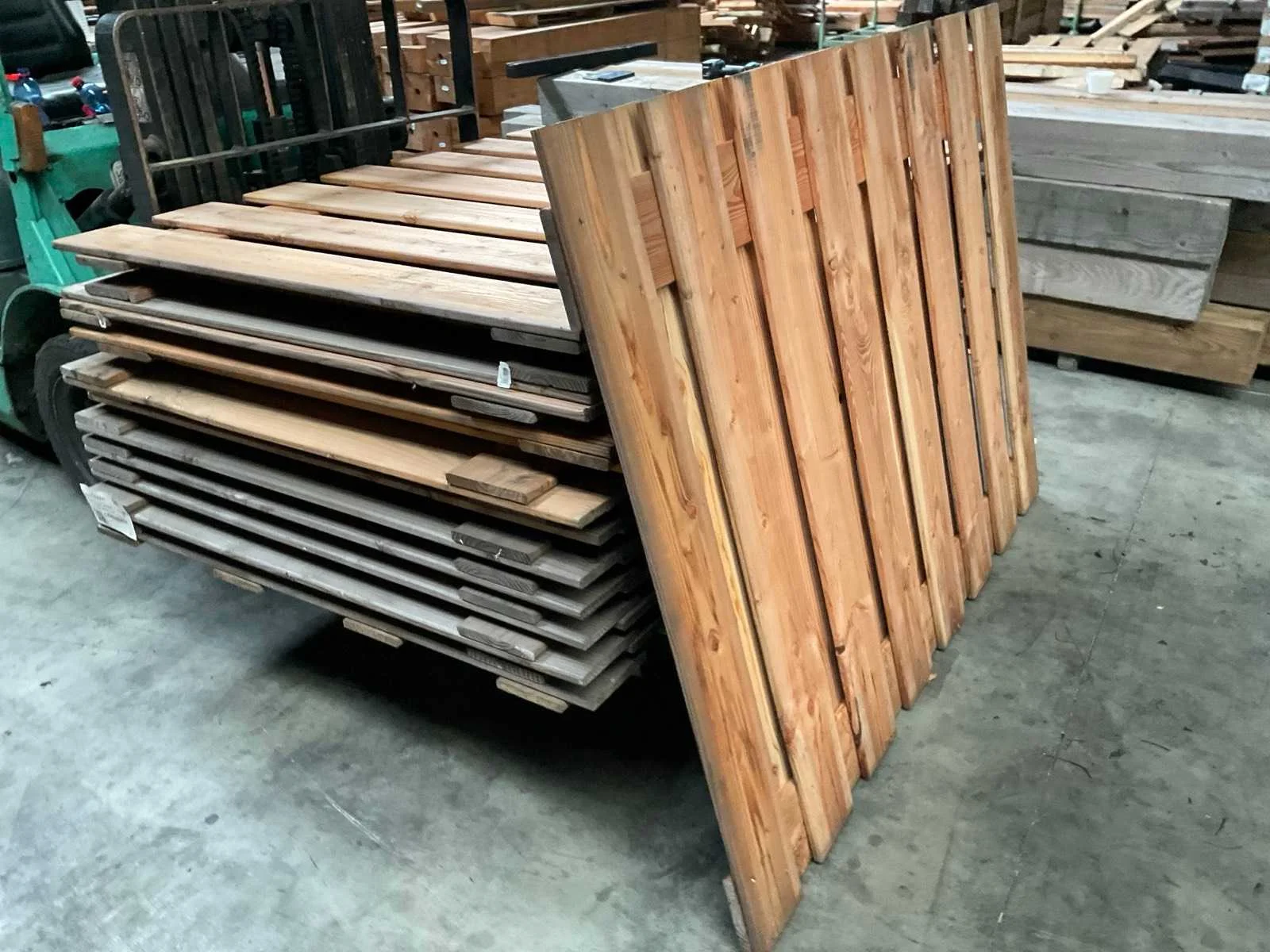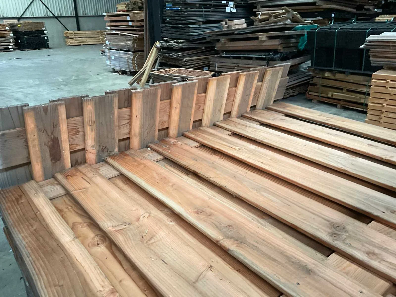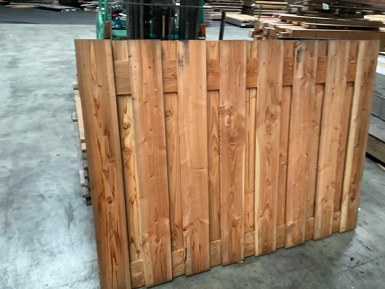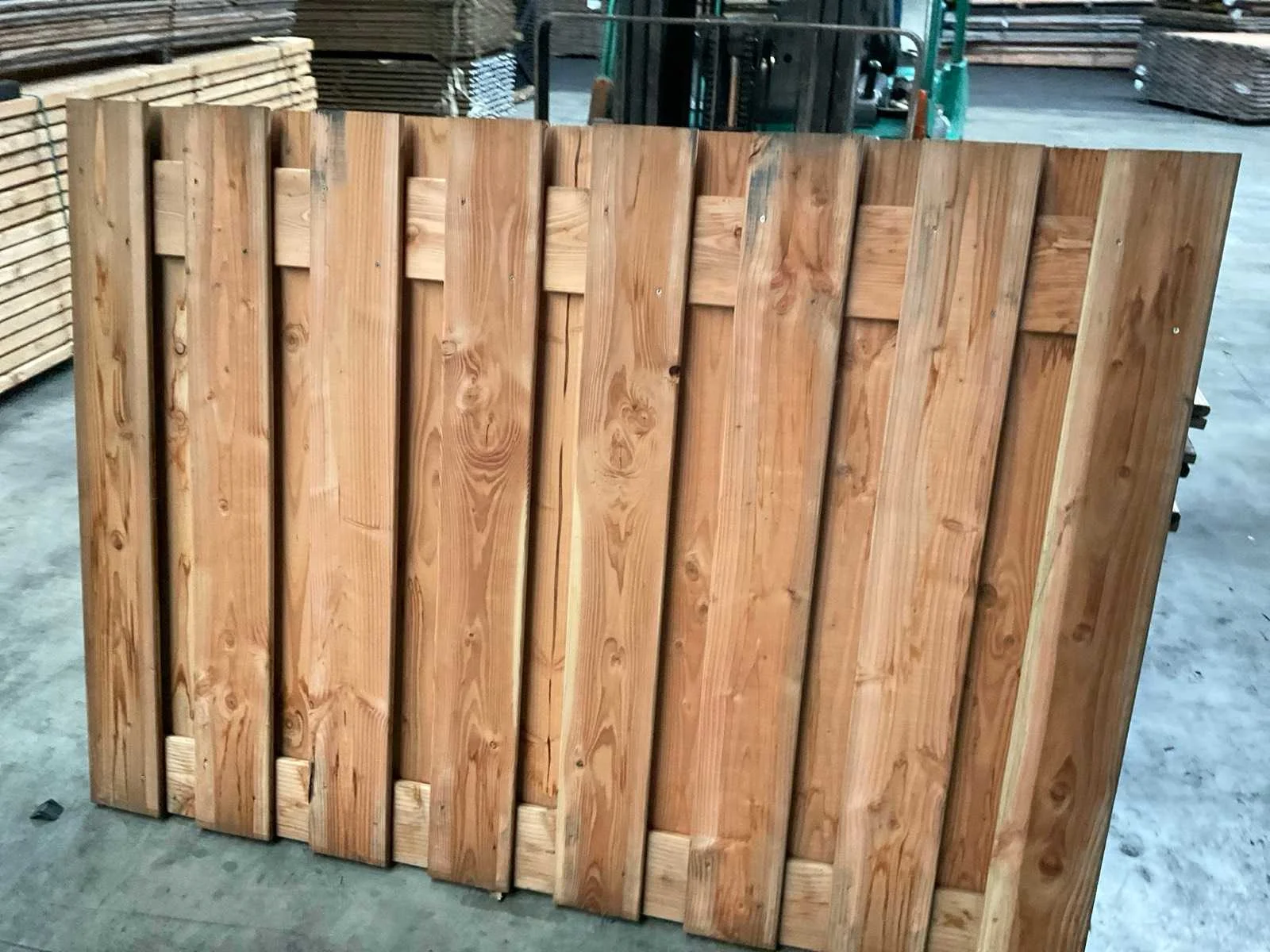 Grenen geschaafd plankenscherm, recht. Gemaakt van 19 planken en 2 tussenplanken. Planken zijn 1,5x14 cm. Groen geïmpregneerd. LET OP dit is een retour pallet.deels licht vergrijst Merk: Woodvision Model: Plankenscherm Gewicht: 400kg Lengte: 180cm Breedte: 5cm Hoogte: 140cm Materiaal: Douglas