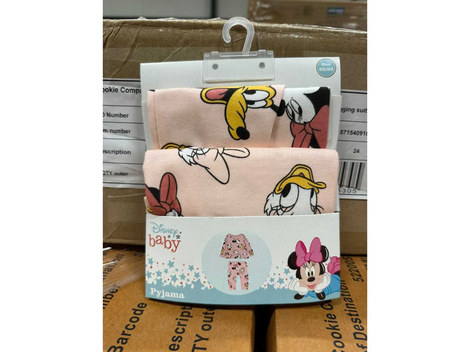 Partij van 100 stuks originele Disney baby- en kinderkleding (officieel trademark). De mix bevat sokken (maat 16/18 & 19/22), pyjama’s, rompers, schortjes en joggingpakken in kledingmaten 62/68, 74/80 en 86/92. Telling per kledingstuk: Een 3-pack telt als 3 stuks, een 2-pack als 2 stuks. Bij setjes (zoals pyjama’s) worden broek en shirt apart geteld. Ideaal voor wederverkoop, outlet of marktkraam. Bestaande uit: Baby- Kinderkleindg 1e: Pyjama 2e: Sokken 3e: Jogginspak 4e: Schort 5e: Rompers