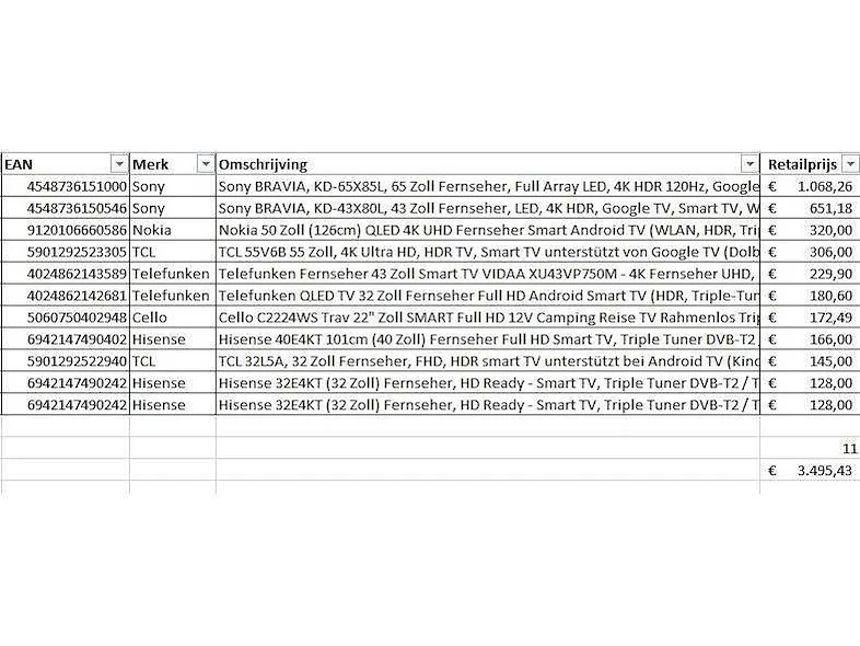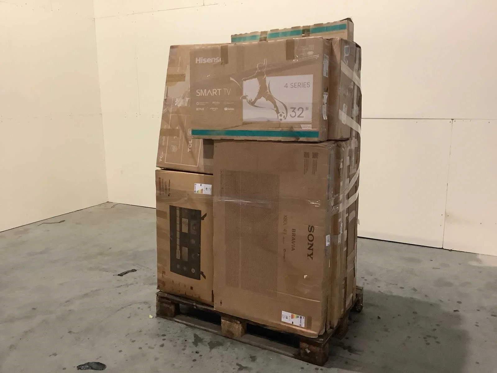 Dit betreft een partij televisies retourgoederen van een grote online retailer. De partij bestaat uit diverse diverse maten televisies. Aantal stuks: 11. Retailwaarde: €3.495,- De televisies zijn niet werkend en zijn te gebruiken voor onderdelen. Kom op de kijkdag om te om zo een goed beeld te krijgen van de reden van retour. Zie foto's voor lijst met inhoud. Merk: Pallet