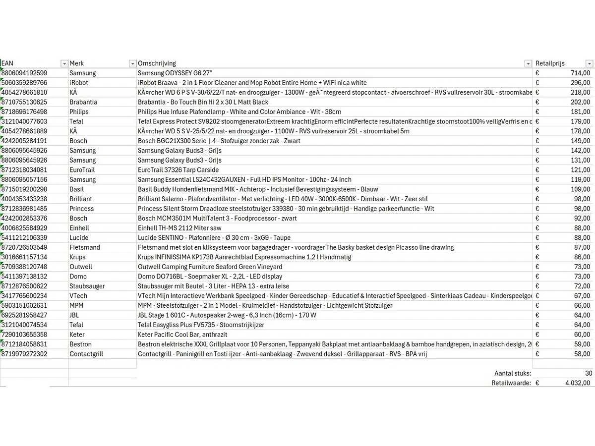 Dit betreft een partij A-merk retourgoederen van een grote online retailer. De partij bestaat uit diverse productcategorieën. Aantal stuks: 30. Retailwaarde: €4032,- Ongecontroleerd: werking onbekend (mix van werkend, incompleet, beschadigd, te gebruiken voor onderdelen). Kom op de kijkdag om te om zo een goed beeld te krijgen van de reden van retour. Zie foto's voor lijst met inhoud. Bezorgtermijn 14 dagen Merk: Pallet Retourgoederen