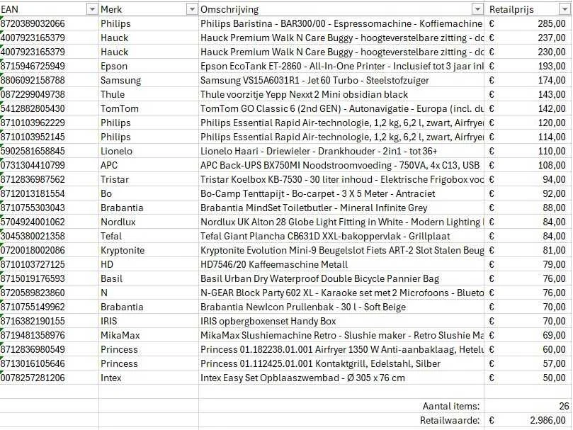Dit betreft een partij A-merk retourgoederen van een grote online retailer. De partij bestaat uit diverse productcategorieën. Aantal stuks: 26. Retailwaarde: €2986,- Ongecontroleerd: werking onbekend (mix van werkend, incompleet, beschadigd, te gebruiken voor onderdelen). Kom op de kijkdag om te om zo een goed beeld te krijgen van de reden van retour. Zie foto's voor lijst met inhoud. Merk: Pallet Retourgoederen