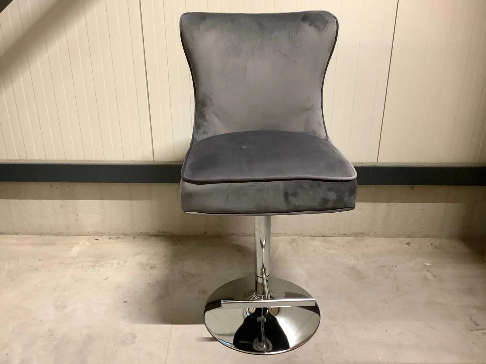 Dit betreft een product nieuw in doos. Let op: in hoogte verstelbaar. Bezorgtermijn 14 dagen Merk: Great Home Kleur: Grijs ( Chrome legs ) Lengte: 52cm Breedte: 61cm Hoogte: 110122cm Materiaal: Metaal / Stof