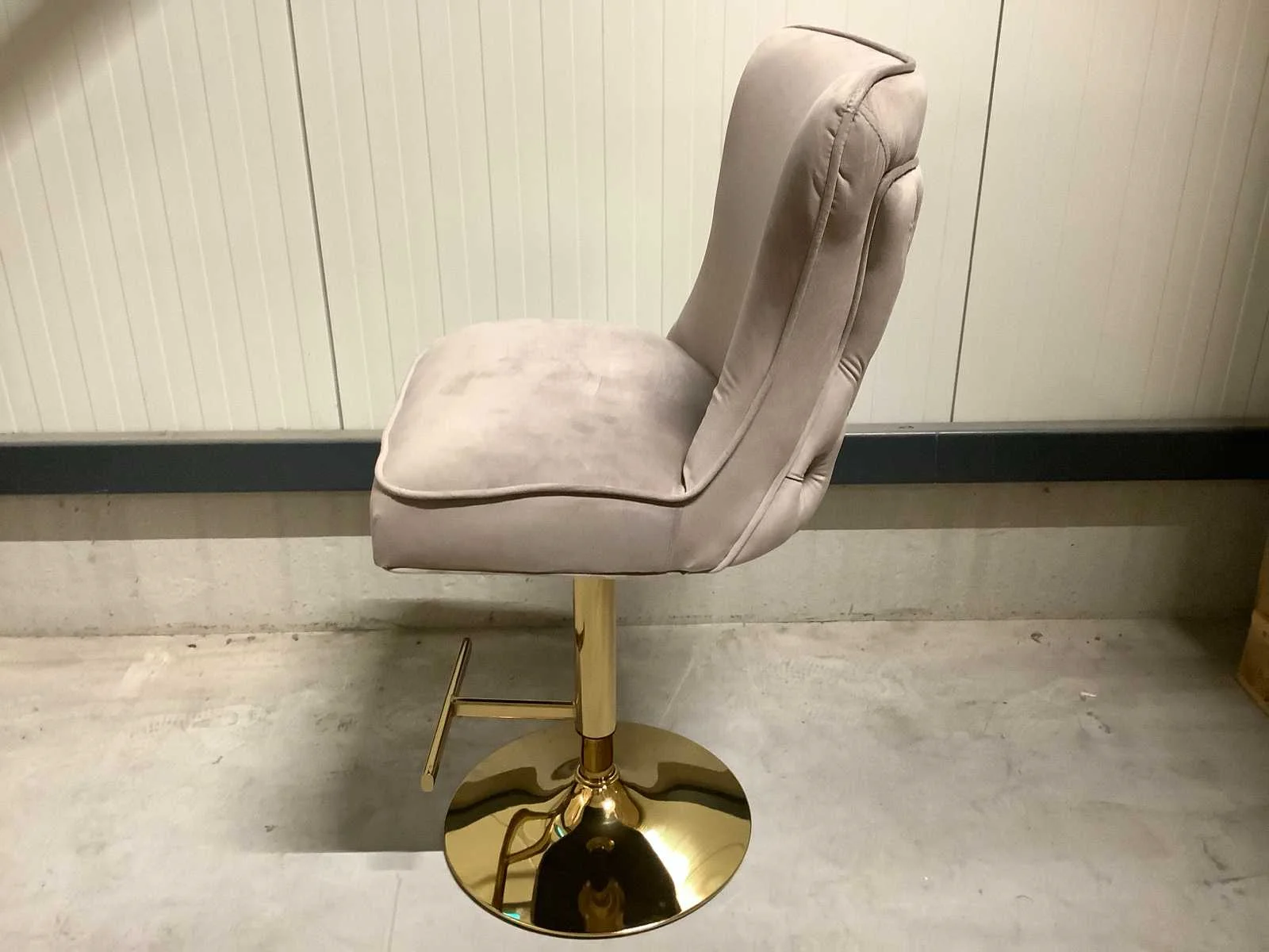 Dit betreft een product nieuw in doos. Let op: in hoogte verstelbaar. Bezorgtermijn 14 dagen Merk: Great Home Kleur: Taupe ( gold legs ) Lengte: 52cm Breedte: 61cm Hoogte: 110122cm Materiaal: Metaal / Stof