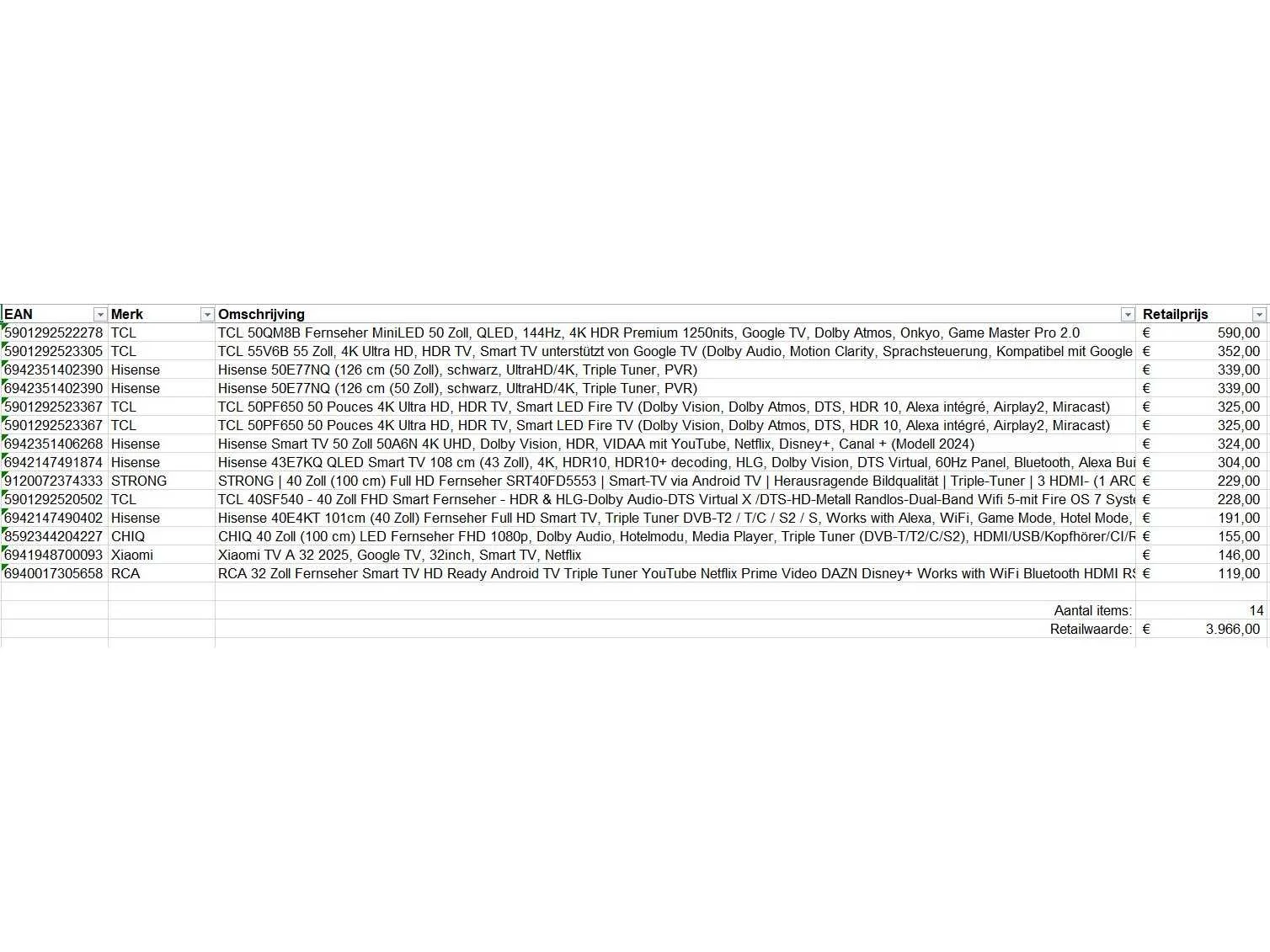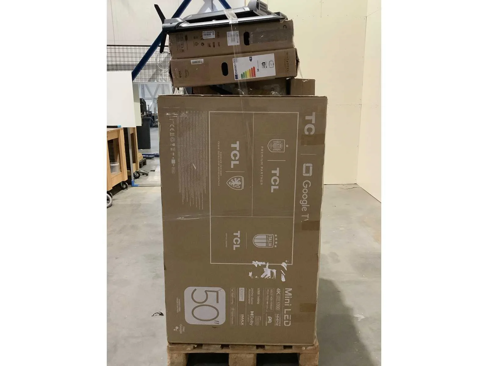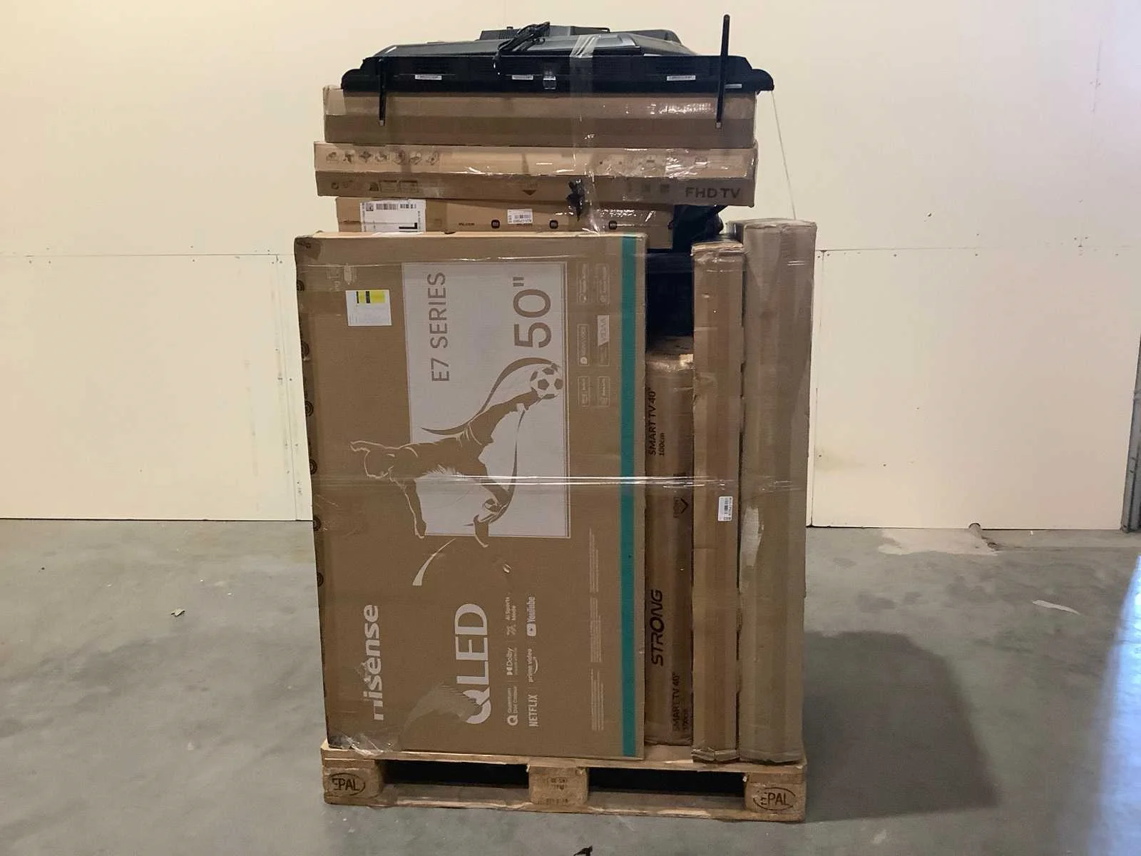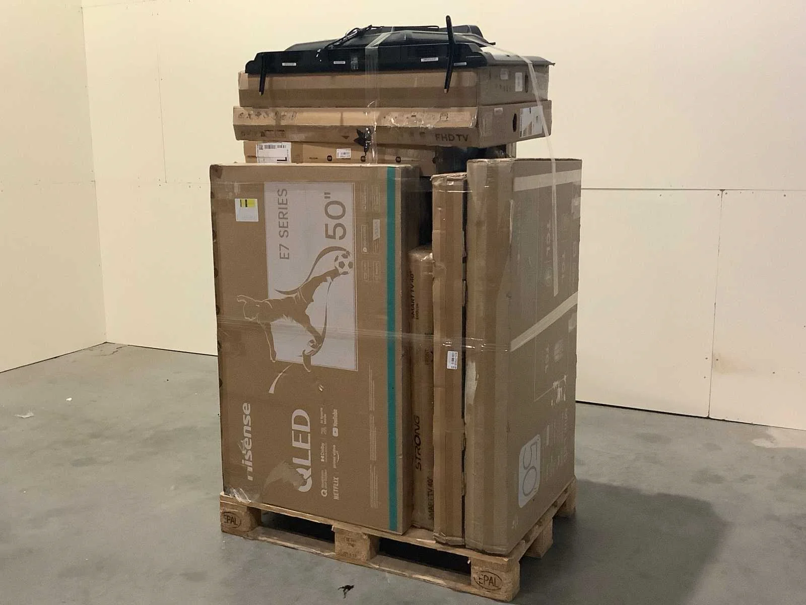 Dit betreft een partij televisies retourgoederen van een grote online retailer. De partij bestaat uit diverse diverse maten televisies. Aantal stuks: 14. Retailwaarde: €3966,- De televisies zijn niet werkend en zijn te gebruiken voor onderdelen. Kom op de kijkdag om te om zo een goed beeld te krijgen van de reden van retour. Zie foto's voor lijst met inhoud. Merk: Pallet Retourgoederen
