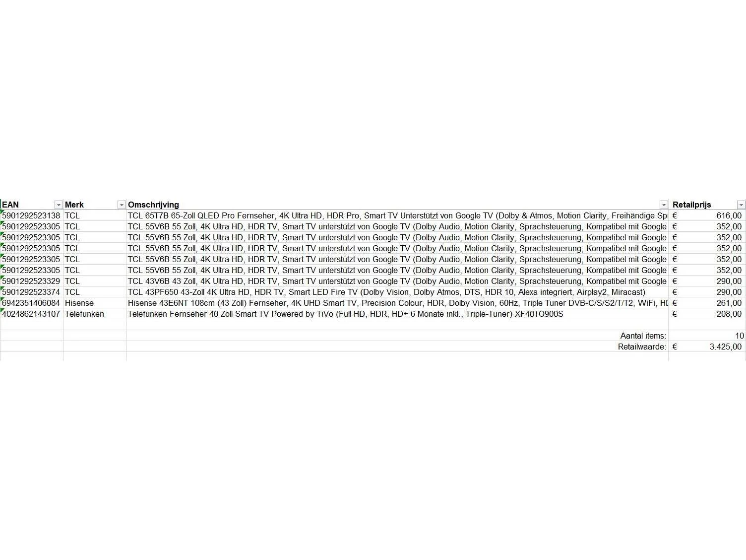 Dit betreft een partij televisies retourgoederen van een grote online retailer. De partij bestaat uit diverse diverse maten televisies. Aantal stuks: 10. Retailwaarde: €3425,- De televisies zijn niet werkend en zijn te gebruiken voor onderdelen. Kom op de kijkdag om te om zo een goed beeld te krijgen van de reden van retour. Zie foto's voor lijst met inhoud. Merk: Pallet Retourgoederen