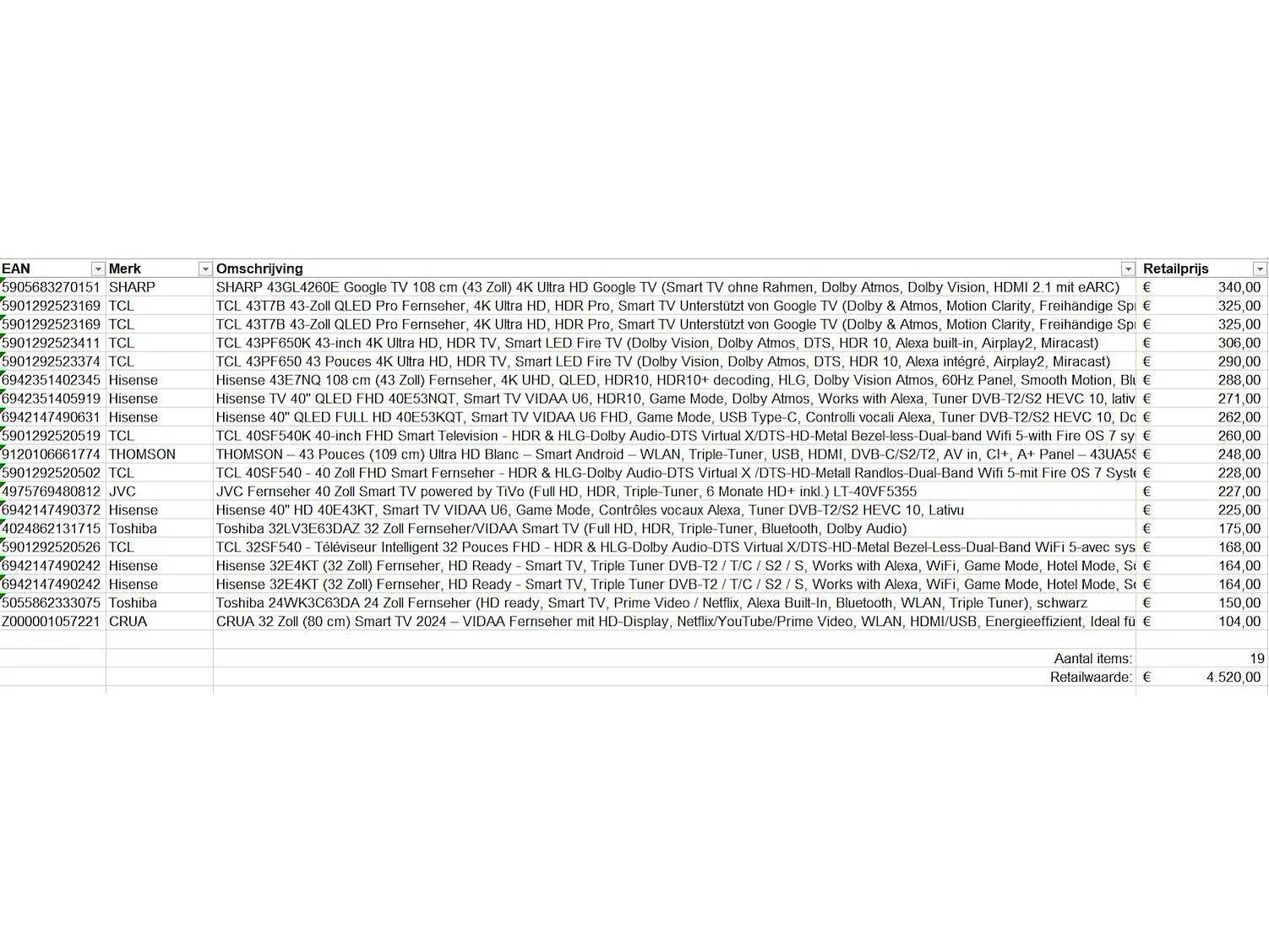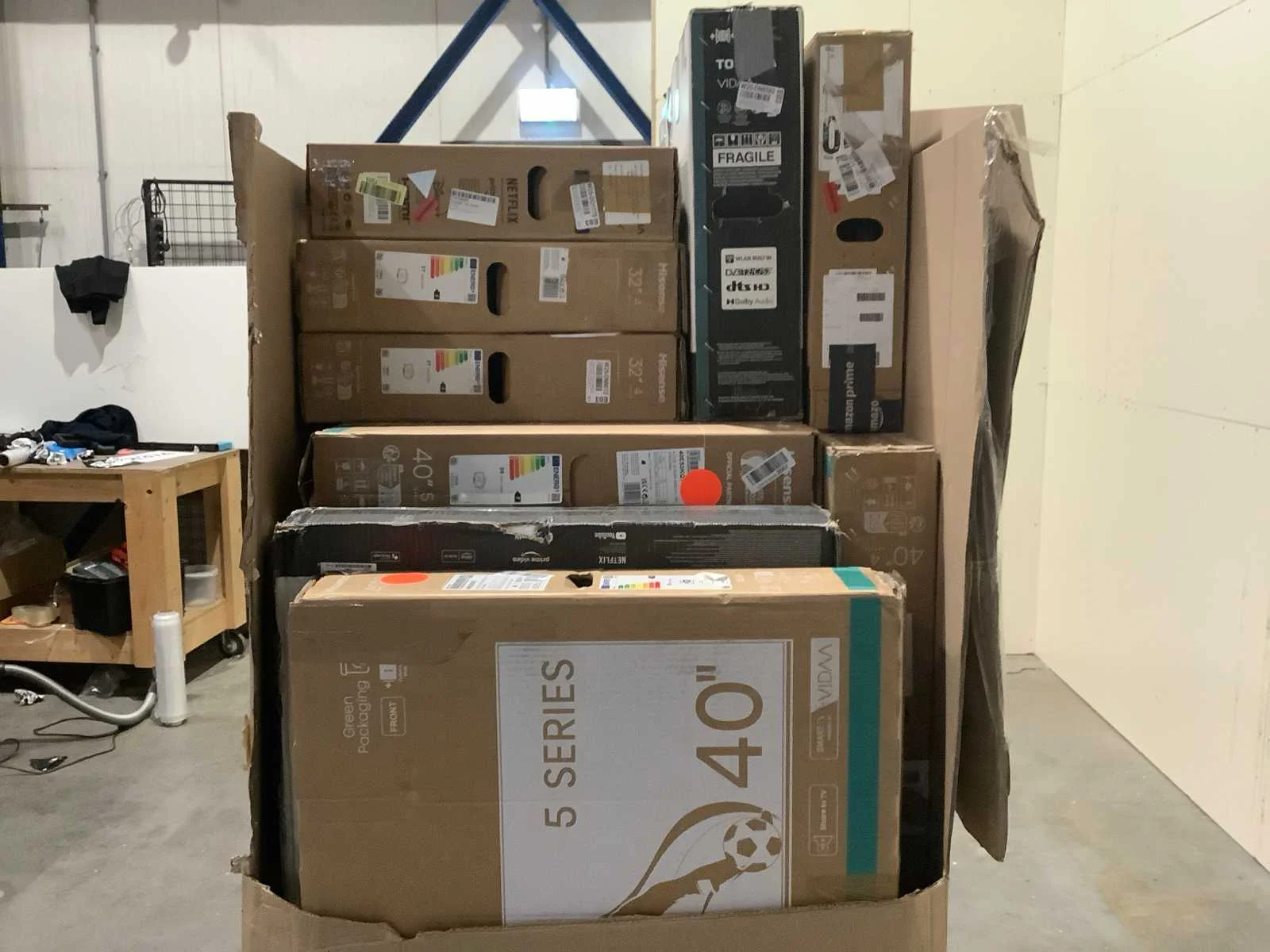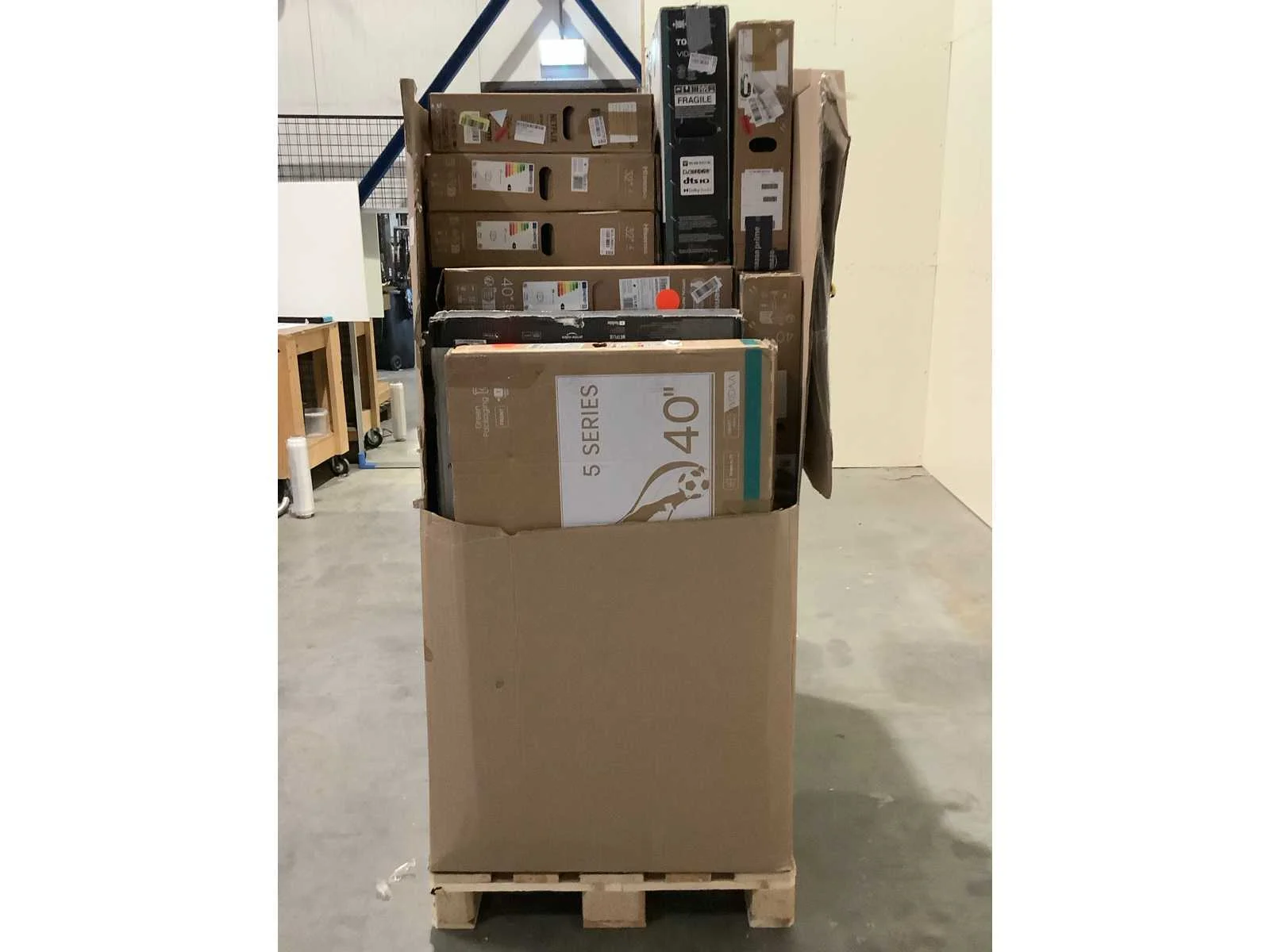 Dit betreft een partij televisies retourgoederen van een grote online retailer. De partij bestaat uit diverse diverse maten televisies. Aantal stuks: 19. Retailwaarde: €4520,- De televisies zijn niet werkend en zijn te gebruiken voor onderdelen. Kom op de kijkdag om te om zo een goed beeld te krijgen van de reden van retour. Zie foto's voor lijst met inhoud. Bezorgtermijn 14 dagen Merk: Pallet Retourgoederen