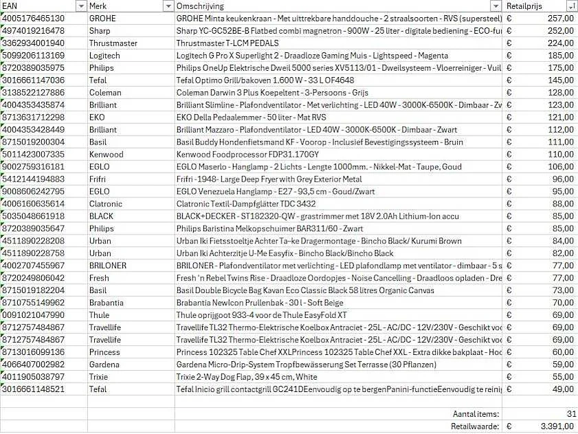 Dit betreft een partij A-merk retourgoederen van een grote online retailer. De partij bestaat uit diverse productcategorieën. Aantal stuks: 31. Retailwaarde: €3391,- Ongecontroleerd: werking onbekend (mix van werkend, incompleet, beschadigd, te gebruiken voor onderdelen). Kom op de kijkdag om te om zo een goed beeld te krijgen van de reden van retour. Zie foto's voor lijst met inhoud. Bezorgtermijn 14 dagen Merk: Pallet Retourgoederen