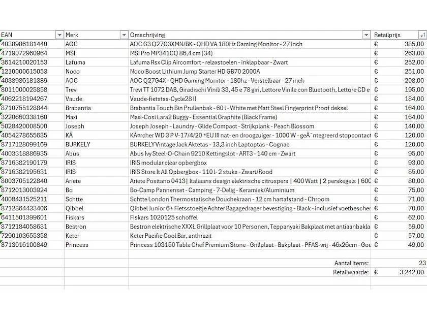 Dit betreft een partij A-merk retourgoederen van een grote online retailer. De partij bestaat uit diverse productcategorieën. Aantal stuks: 23. Retailwaarde: €3242,- Ongecontroleerd: werking onbekend (mix van werkend, incompleet, beschadigd, te gebruiken voor onderdelen). Kom op de kijkdag om te om zo een goed beeld te krijgen van de reden van retour. Zie foto's voor lijst met inhoud. Bezorgtermijn 14 dagen Merk: Pallet Retourgoederen