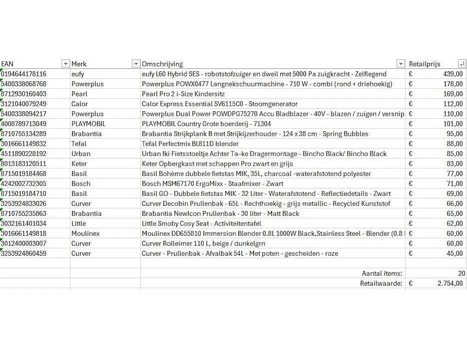 Dit betreft een partij A-merk retourgoederen van een grote online retailer. De partij bestaat uit diverse productcategorieën. Aantal stuks: 20. Retailwaarde: €2754,- Ongecontroleerd: werking onbekend (mix van werkend, incompleet, beschadigd, te gebruiken voor onderdelen). Kom op de kijkdag om te om zo een goed beeld te krijgen van de reden van retour. Zie foto's voor lijst met inhoud. Bezorgtermijn 14 dagen