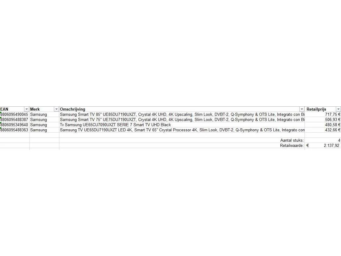 Dit betreft een partij televisies retourgoederen van een grote online retailer. De partij bestaat uit diverse diverse maten televisies. Aantal stuks: 4. Retailwaarde: €2.137,- De televisies zijn niet werkend en zijn te gebruiken voor onderdelen. Kom op de kijkdag om te om zo een goed beeld te krijgen van de reden van retour. Zie foto's voor lijst met inhoud. Bezorgtermijn 14 dagen Merk: Pallet Retourgoederen