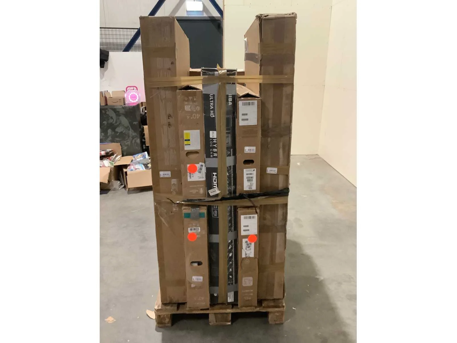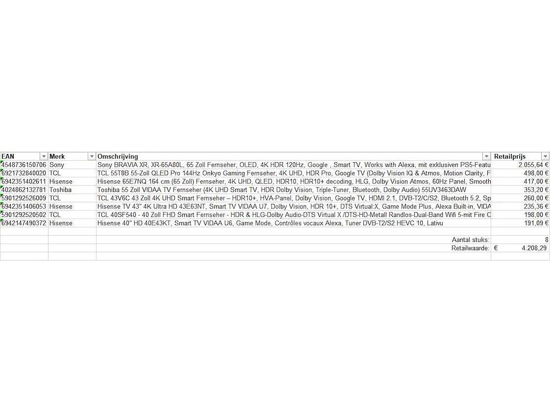 Dit betreft een partij televisies retourgoederen van een grote online retailer. De partij bestaat uit diverse diverse maten televisies. Aantal stuks: 8. Retailwaarde: €4.208,- De televisies zijn niet werkend en zijn te gebruiken voor onderdelen. Kom op de kijkdag om te om zo een goed beeld te krijgen van de reden van retour. Zie foto's voor lijst met inhoud. Bezorgtermijn 14 dagen Merk: Pallet Retourgoederen