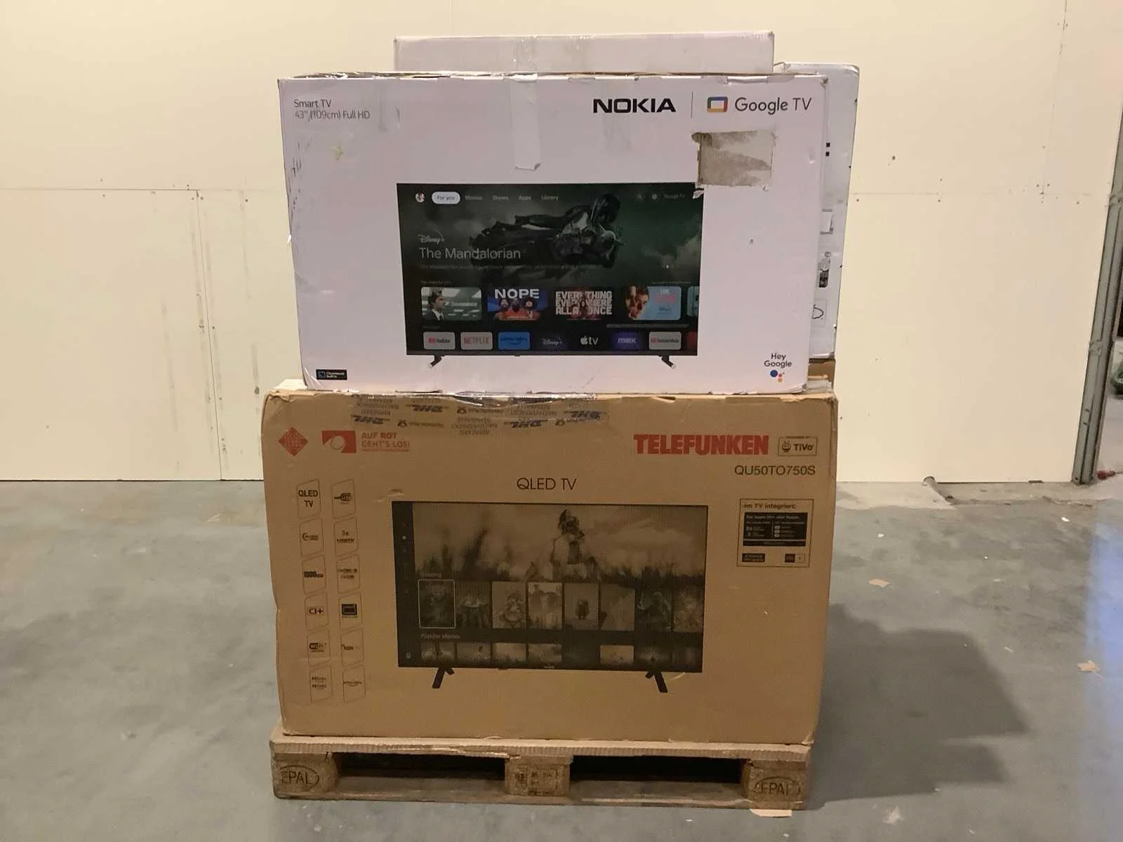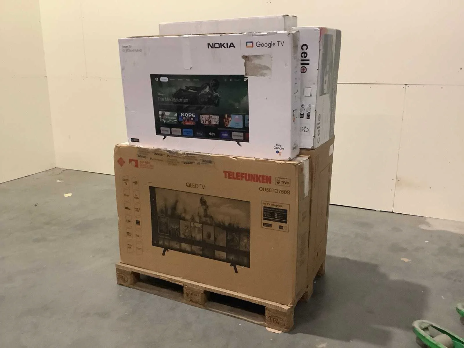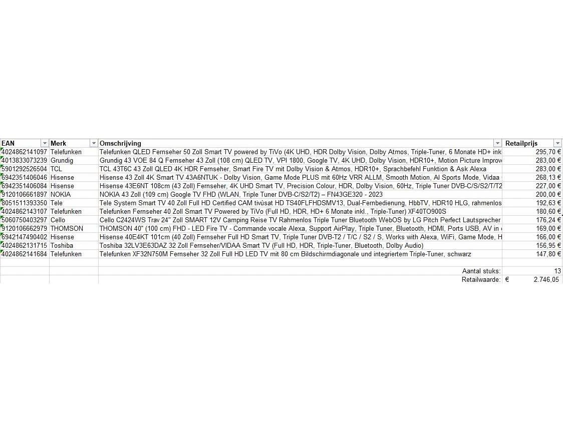 Dit betreft een partij televisies retourgoederen van een grote online retailer. De partij bestaat uit diverse diverse maten televisies. Aantal stuks: 13. Retailwaarde: €2.746,- De televisies zijn niet werkend en zijn te gebruiken voor onderdelen. Kom op de kijkdag om te om zo een goed beeld te krijgen van de reden van retour. Zie foto's voor lijst met inhoud. Bezorgtermijn 14 dagen Merk: Pallet Retourgoederen
