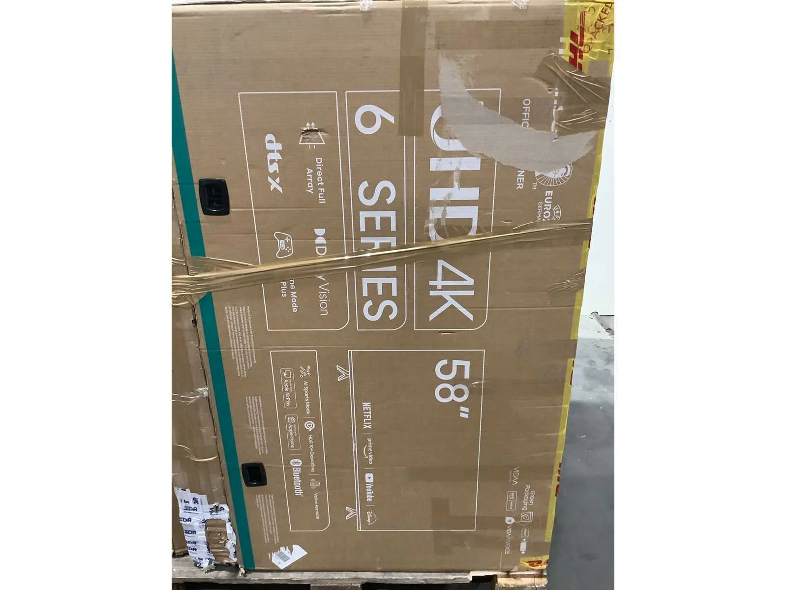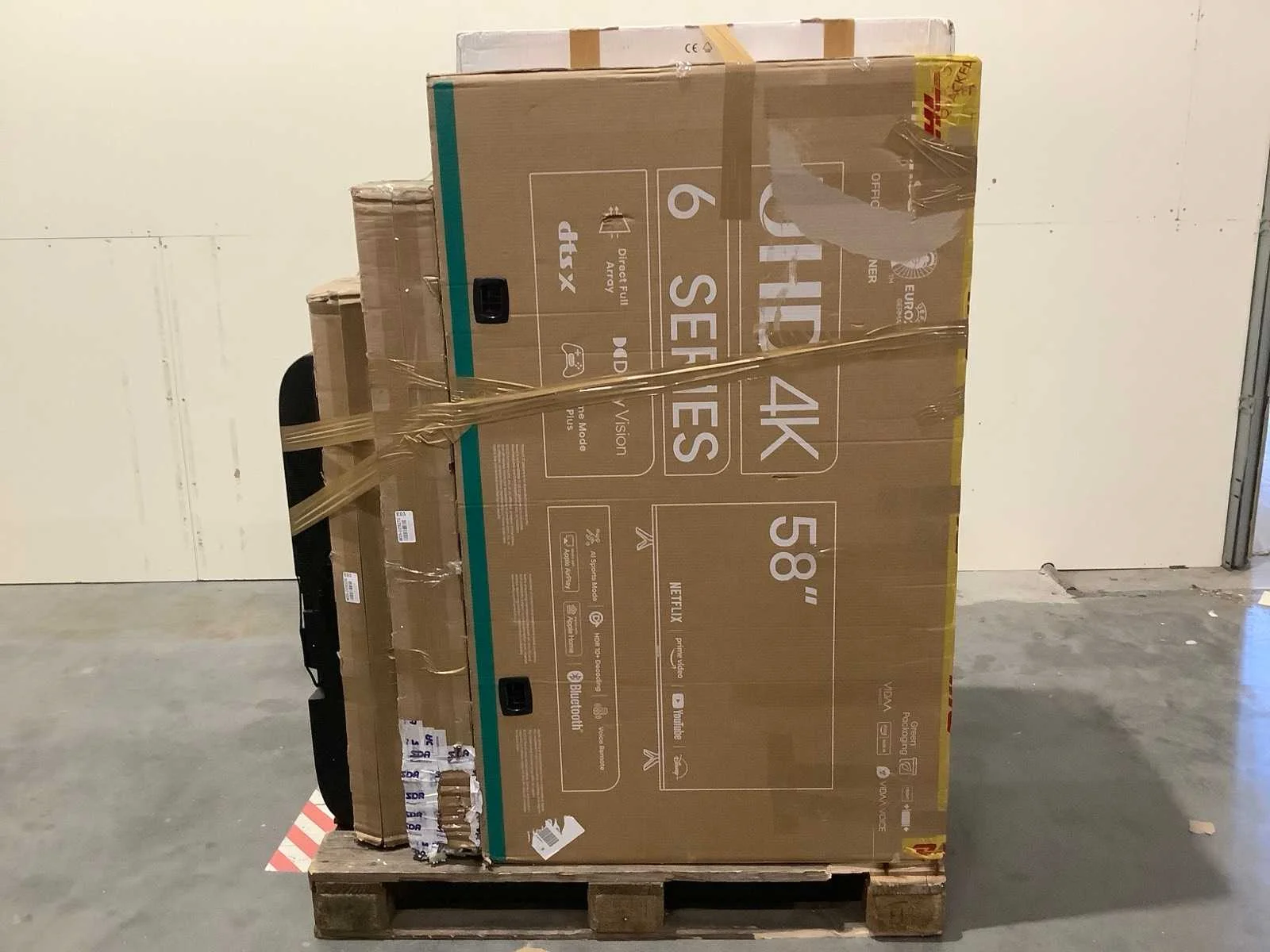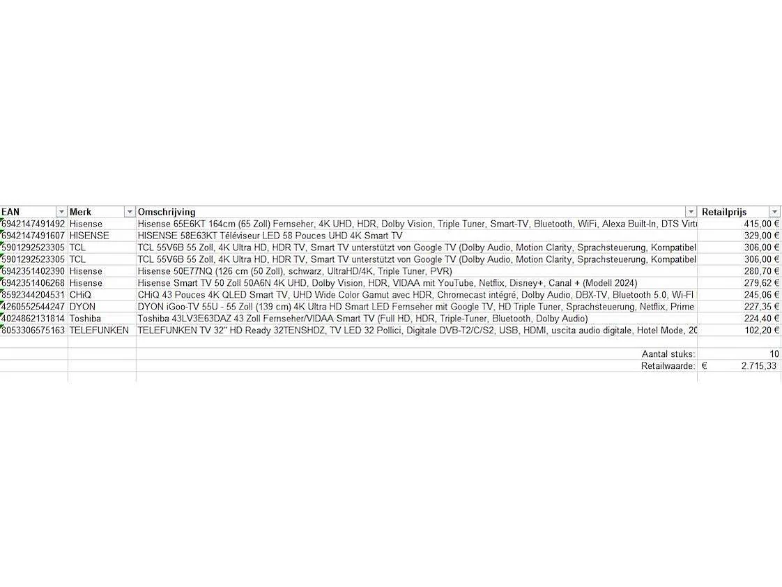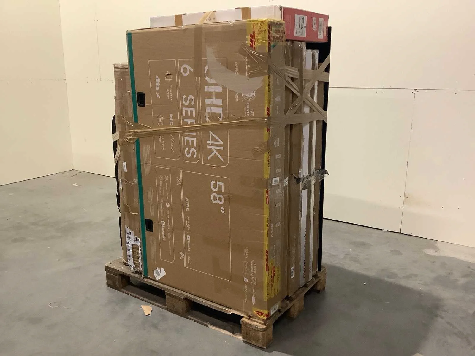 Dit betreft een partij televisies retourgoederen van een grote online retailer. De partij bestaat uit diverse diverse maten televisies. Aantal stuks: 10. Retailwaarde: €2.715,- De televisies zijn niet werkend en zijn te gebruiken voor onderdelen. Kom op de kijkdag om te om zo een goed beeld te krijgen van de reden van retour. Zie foto's voor lijst met inhoud. Bezorgtermijn 14 dagen Merk: Pallet Retourgoederen