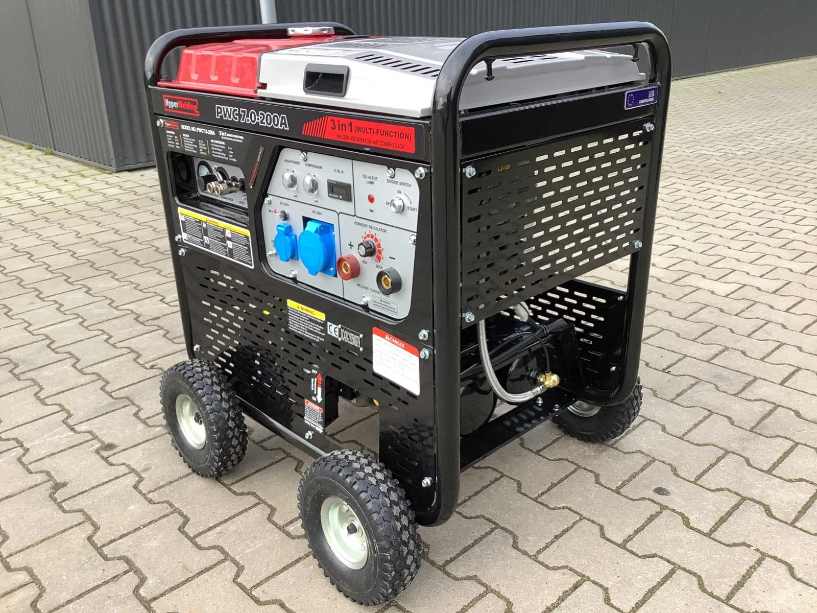 3-in-1 mobiel werkstation met 5,5 kVA stroomgenerator met 230 Volt outlet, klein/groot (= functie 1), lasapparaat met 200 Ampère stroomsterkte (= functie 2); 1,35 kW luchtcompressor, 10 liter tankinhoud, 8 Bar (= functie 3). voorzien van 420 cm3 benzinemotor; elektrische start + trekstart; wordt geleverd inclusief 12 Volt startaccu; diverse toebehoren; handboek; ongebruikt Merk: Hyper Welding Type: PWC 7.0-200A Multi-Function Bouwjaar: 2025 Handboek aanwezig: true