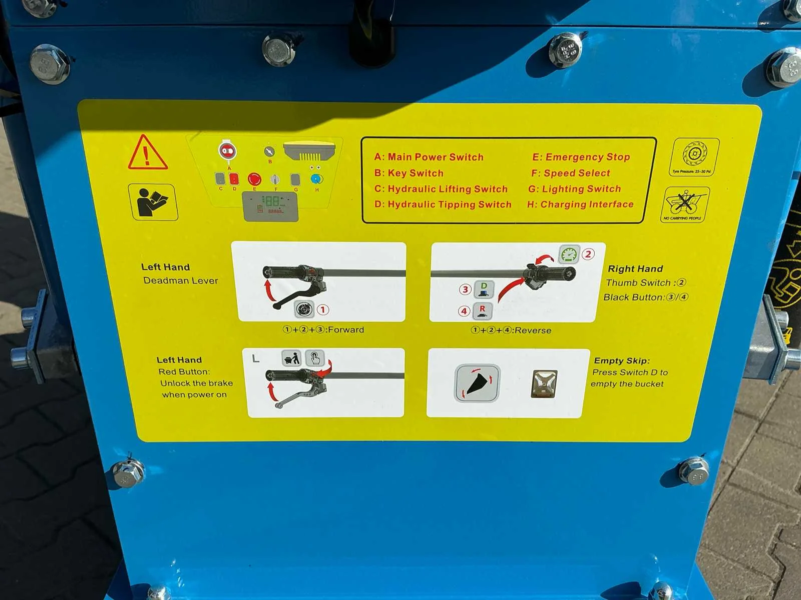 Elektrisch aangedreven, zelfrijdend, voorzien van hydraulische kiepfunctie, 3 rijsnelheden, LED werkverlichting, digitaal display, autonomie 8-10 werkuren, ongebruikt in krat Merk: Field Type: D500E Laadvermogen: 500kg Eigen gewicht: 300kg Totale afmeting L: 1771mm Totale afmeting Breedte: 891mm Totale afmeting Hoogte: 1114mm