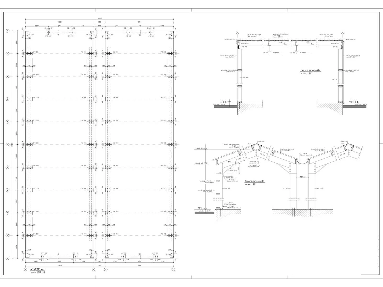 Dubbele complete staal constructie; totaal 30,5x50 meter; bouwjaar 2024; bestaand uit; 4 kopspanten IPE160; 18 tussenspanten IPE300/270; 16 windverbanden; 8 windbokken; dakgordingen 75x200mm; wandgordingen 75x175mm; damwandprofiel dakplaten; damwandprofiel wandplaten; linkerwand en linker voorwand brandwerende sandwich panelen; kilgoot; regenwater afvoer tot aan het maaiveld; 2 schuifdeuren 4500mm hoog 6000mm breed de positie op de tekening is veranderd van links voor naar rechts aan de zijkant; 4 loopdeuren; inclusief tekeningen en berekeningen; demontage dient door de koper gedaan te worden; dit dient gedaan te worden met de wettelijke eisen voor veiligheid; verwachte startdatum demontage 12 november Materiaal: staal Type: Hallen staalconstructie Bouwjaar: 2024 Totaal oppervlakte: 1525m² Nok hoogte: 7437mm Goot hoogte: 5000mm Totale afmeting L: 50000mm Totale afmeting Breedte: 30500mm