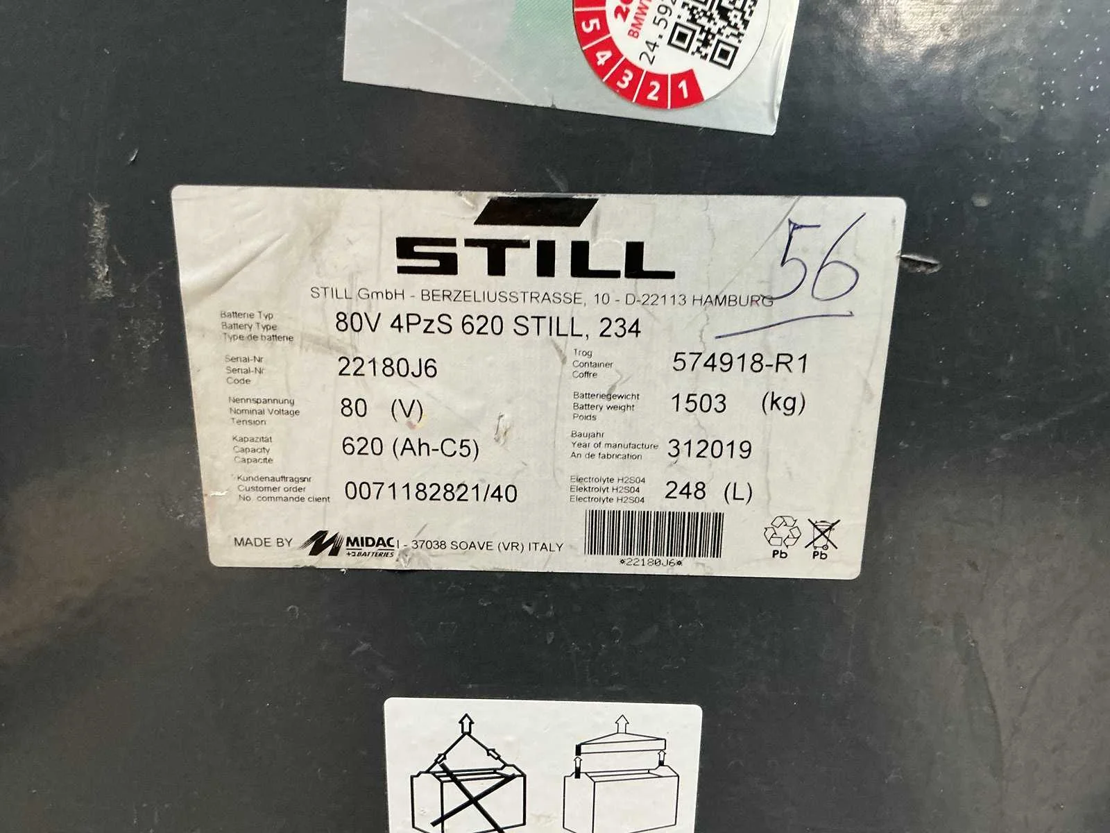74% Merk: STILL Type: 80V 4PzS 620A Bouwjaar: 2019 Serienummer: 22180J6 Spanning: 80V Laadstroom: 620A Eigen gewicht: 1503kg Totale afmeting L: 1025mm Totale afmeting Breedte: 710mm Totale afmeting Hoogte: 770mm