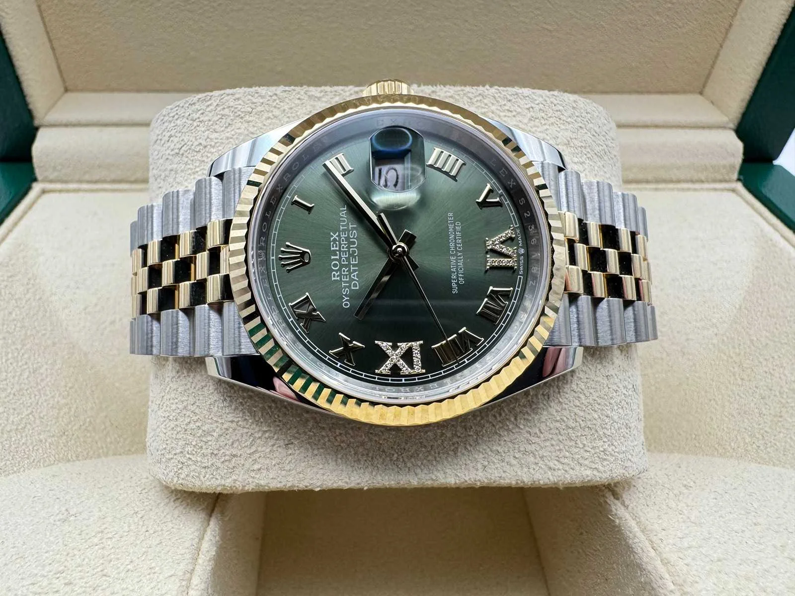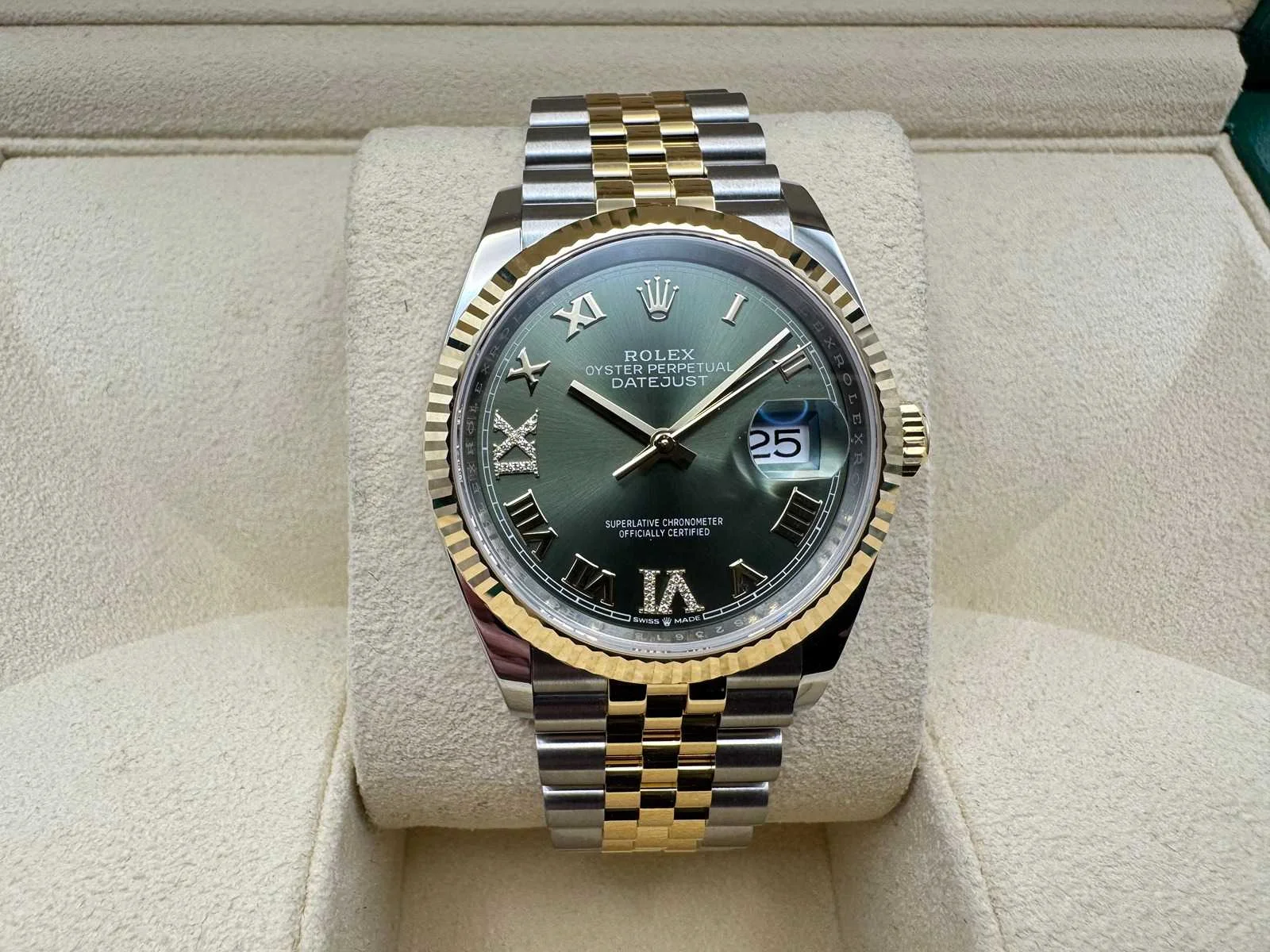 This brand-new, unworn Rolex Datejust 36 Ref. 126233 is an exquisite timepiece that combines timeless elegance with modern sophistication. Crafted from stainless steel and 18k yellow gold, it features the classic Jubilee bracelet for ultimate comfort and style. The stunning olive green dial is beautifully accented by factory-set diamonds at 6 and 9 o’clock, adding a refined touch of luxury. The watch comes as a full set, including the original Rolex box, booklets, warranty card holder, and Rolex guarantee card. It is covered by Rolex’s 5-year international warranty, ensuring complete peace of mind. Key Features: Model: Rolex Datejust 36 Ref. 126233 Condition: Brand new, unworn Material: Stainless steel & 18k yellow gold Bracelet: Jubilee Dial: Olive green with factory-set diamonds at 6 and 9 o’clock Bezel: Fluted 18k yellow gold International warranty: 5 years remaining Full set: Includes box, papers, warranty card, and Rolex tag A rare and highly desirable timepiece, this Rolex Datejust 36 is a true statement of sophistication. A must-have for collectors and watch enthusiasts alike. Merk: Rolex Model: Datejust 36 Bouwjaar: 10-2025 Referentienummer: 126233 Materiaal kast: Steel / yellow gold Materiaal horlogeband: Steel / yellow gold Materiaal sluiting: Steel / yellow gold Wijzerplaat: Olive green with diamonds on the 6&9 Kastmaat: 36 mm