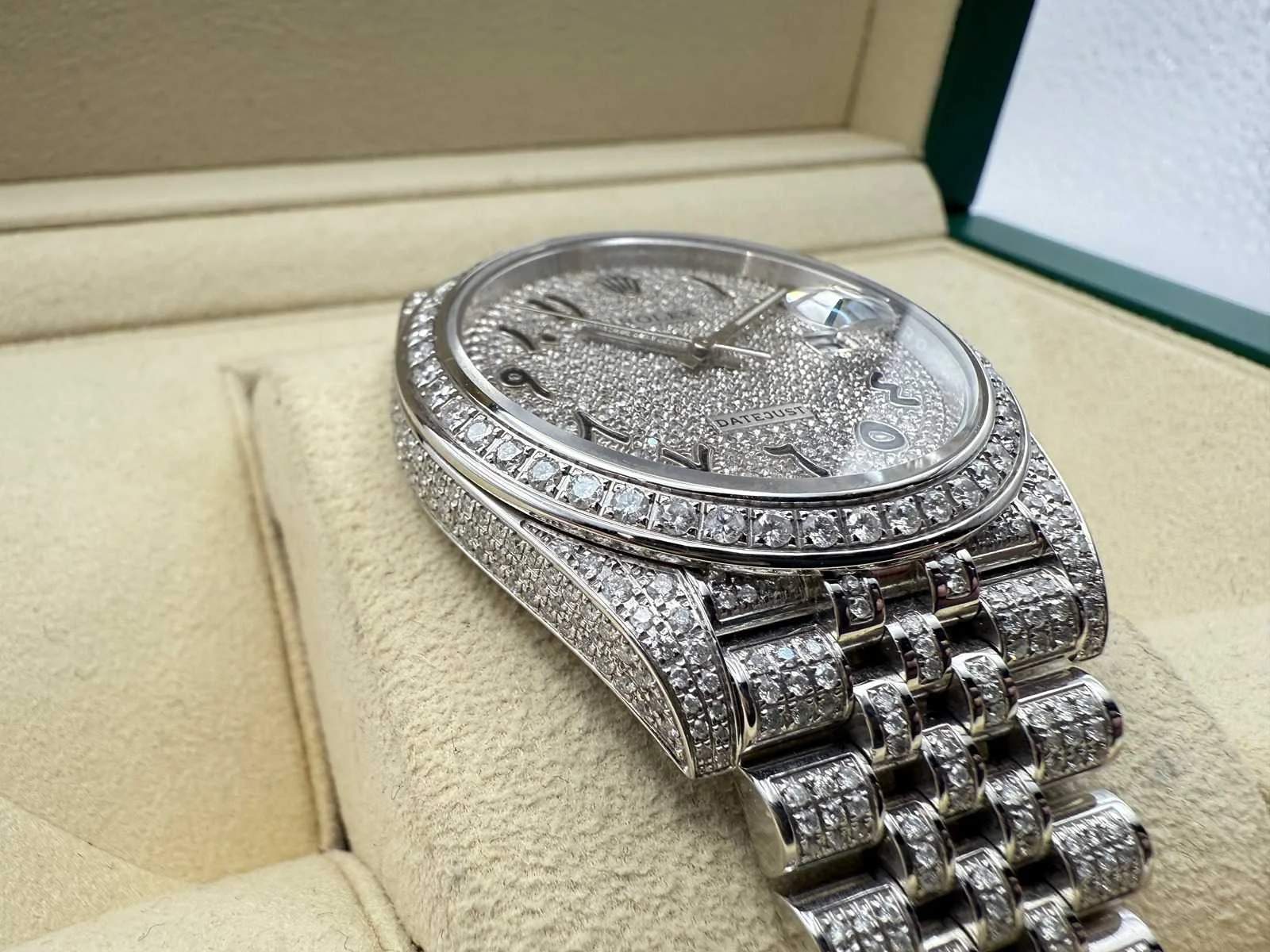 Rolex Datejust 41mm “Iced Out” – Fully Set with Diamonds This breathtaking Rolex Datejust 41mm, completely covered in diamonds, including the dial, is in brand-new and unworn condition. Often referred to as “iced out,” this stunning timepiece is a true statement of luxury. It comes as a full set, including the original Rolex box, booklets, warranty card holder, Rolex guarantee card, and tag. Key features: Model: Rolex Datejust 41mm Condition: Brand new, unworn Full diamond setting: Case, bracelet, and dial are fully set with diamonds Full set: Includes box, papers, warranty card, and Rolex tag This exceptional piece is a rare find, offering unmatched elegance and a striking appearance, perfect for collectors or anyone seeking a truly unique luxury watch. Merk: Rolex Model: Datejust Bouwjaar: 2021 Referentienummer: 126300 Materiaal kast: Steel / Diamonds Materiaal horlogeband: Steel / Diamonds Materiaal sluiting: Steel / Diamonds Wijzerplaat: Diamonds Kastmaat: 41 mm