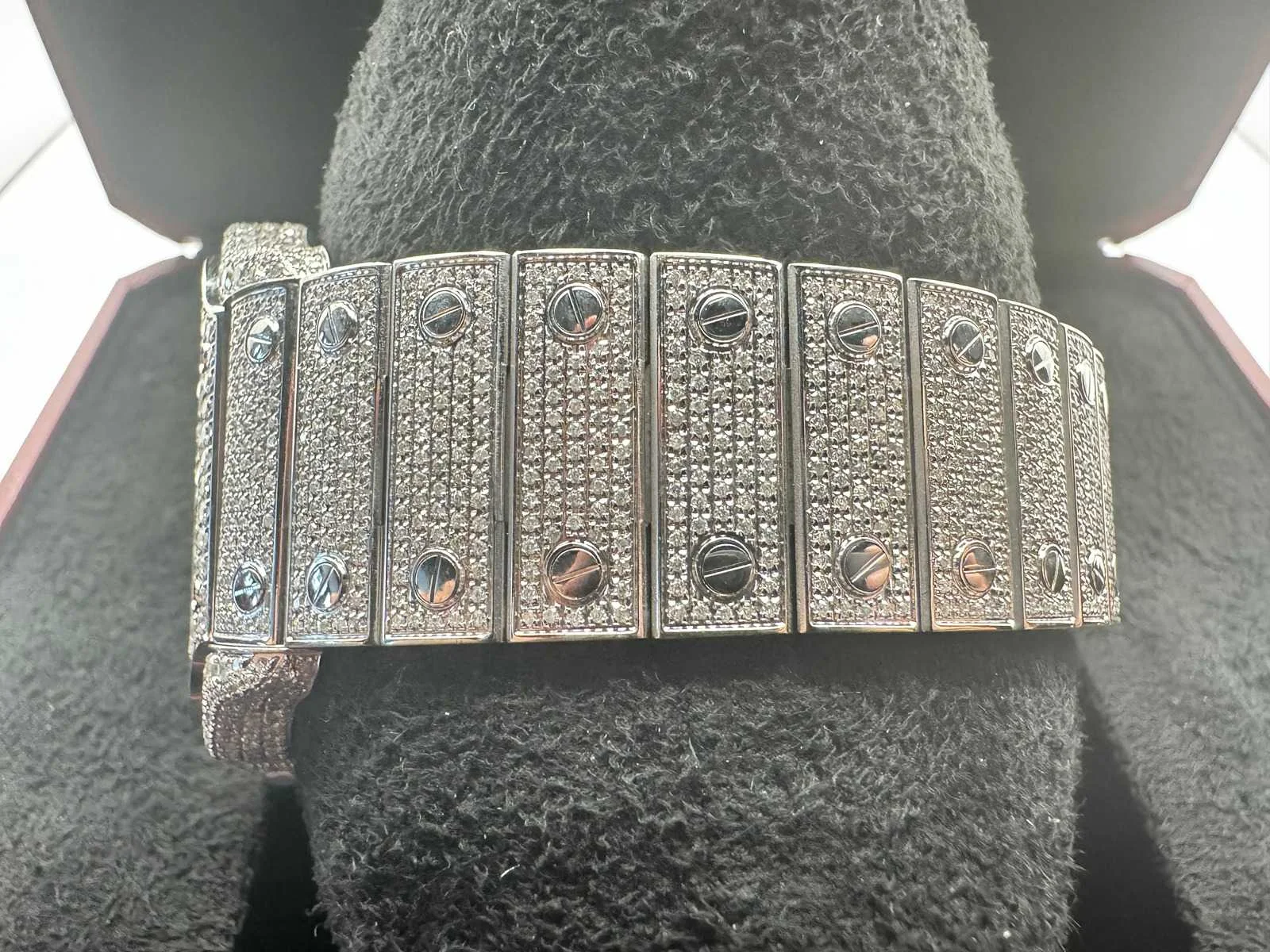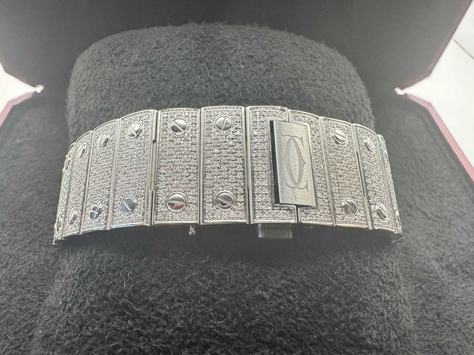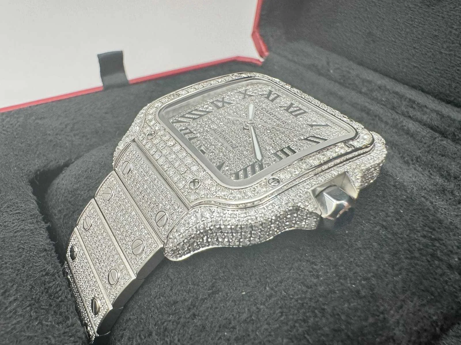 We presenteren de Cartier Santos Large WSSA0018, een waar symbool van luxe en verfijning. Dit schitterende horloge is gloednieuw en volledig ongedragen. Wat dit model echt onderscheidt, is dat het volledig bezet is met echte naturel VS diamanten, ook wel "iced out" genoemd, wat het een ongekende glans en allure geeft. De Cartier Santos Large is een gevierd klassiek model, bekend om zijn elegante ontwerp en uitmuntende vakmanschap. De diamanten op dit horloge zijn met uiterste precisie gezet, wat zorgt voor een adembenemend effect. Belangrijkste Kenmerken: • Conditie: Gloednieuw en ongedragen van 2024 • Diamantzetting: Volledig bezet met echte naturel VS diamanten, ook wel "iced out" genoemd • Complete Set: Inclusief originele Cartier doos, papieren en Cartier authenticatiepas • Referentienummer: WSSA0018 • Wijzerplaat: Iconische Cartier wijzerplaat met Romeinse cijfers volledig bezet met natural diamanten • Kast: Grote roestvrijstalen kast, perfect in harmonie met de fonkelende diamantzetting • Armband: Bijpassende roestvrijstalen armband, eveneens bezet met diamanten. Aanvullende Informatie: • Verpakking: Dit horloge wordt geleverd als een volledige set met de originele Cartier doos, officiële papieren en de Cartier authenticatiepas. De Cartier Santos Large WSSA0018 is meer dan alleen een horloge; het is een bewijs van stijl, elegantie en luxe. Of u nu een verzamelaar bent of iemand die een gedurfde en verfijnde indruk wil maken, dit met diamanten bezette horloge is de perfecte keuze. Omarm het toppunt van horlogekunst met deze prachtige Cartier Santos. Merk: Cartier Model: Santos Bouwjaar: 2024 Referentienummer: WSSA0018 Materiaal kast: Steel / Diamonds Materiaal horlogeband: Steel / Diamonds Materiaal sluiting: Steel / Diamonds Wijzerplaat: Diamonds Kastmaat: 39 mm