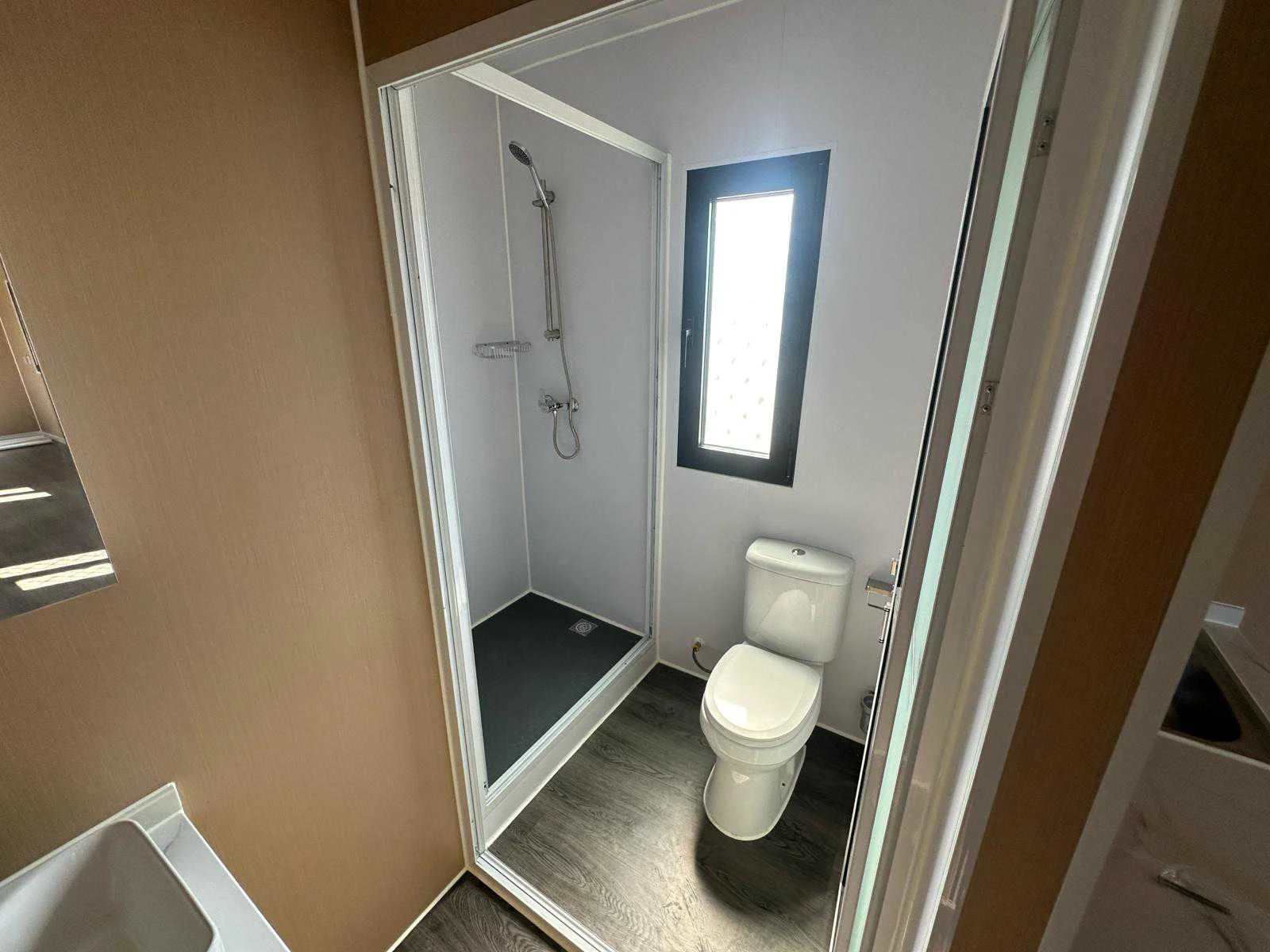 Voorzien van 1 woning; 1 badkamer; 1 toilet; 1 keuken blok; riool, water en stroom aansluiting allemaal voorbereid dus makkelijk aan te sluiten; meterkast; deur stopper; lepel gaten; ongebruikt Merk: Rhino-Cross-Containers Model: 1 Deur en 3 Ramen Zwart Product type: 40ft HQ/12 M Kleur: Zwart Materiaal: Staal