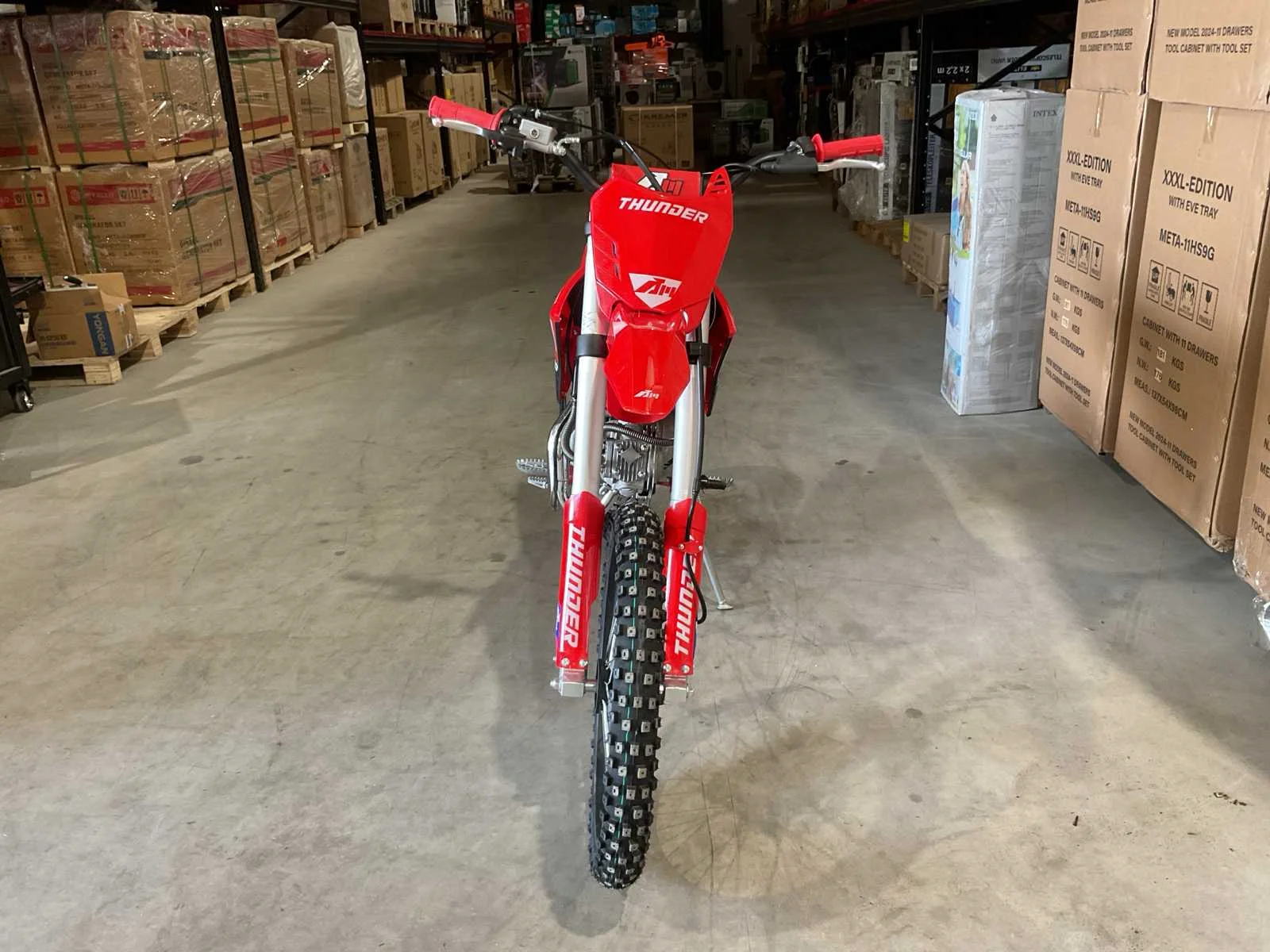 Voorzien van 125 cc motor; 4 takt; kick start; bandenmaat voor 19” inch achter 16” inch; hydraulische vering voor en achter; schijfremmen; ongebruikt in doos (transport afmetingen 150x40x75 cm) Merk: Ultra Motocross Type: Thunder 125 BL Brandstof: Benzine 4 Takt Cilinderinhoud: 125cc Gewicht: 91kg Kleur: Blauw Transmissie: Schakel Aantal sleutels: 2