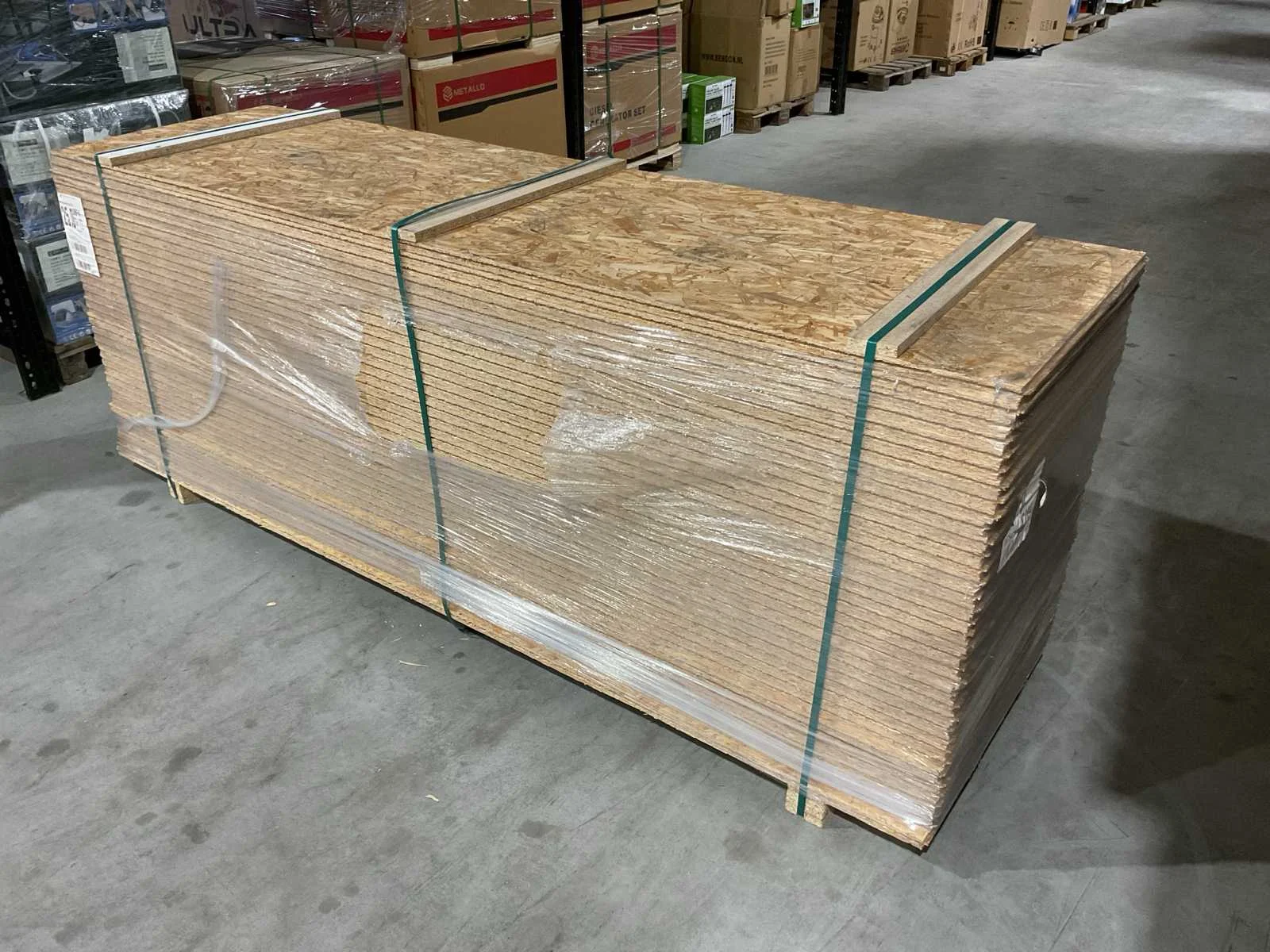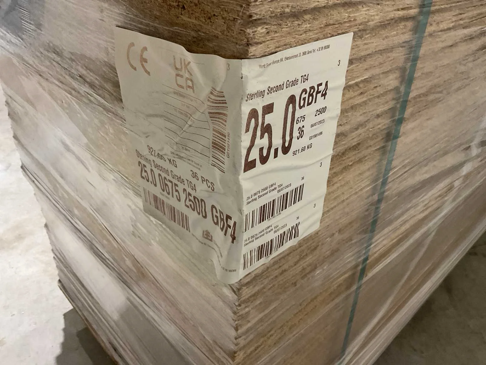 Voorzien van GBF4; 36 platen; 675x2500x25 mm per plaat; Ongebruikt (Afmeting transport verpakking 2500x675x960 mm lxbxh, gewicht 921.6 kg) Merk: OSB Type: 2500x675x25 (36x) Plaatafmeting l: 2500mm Plaatafmeting b: 675mm Dikte: 25mm Eigen gewicht: 921.6kg Totale afmeting L: 2500mm Totale afmeting Breedte: 675mm Totale afmeting Hoogte: 960mm