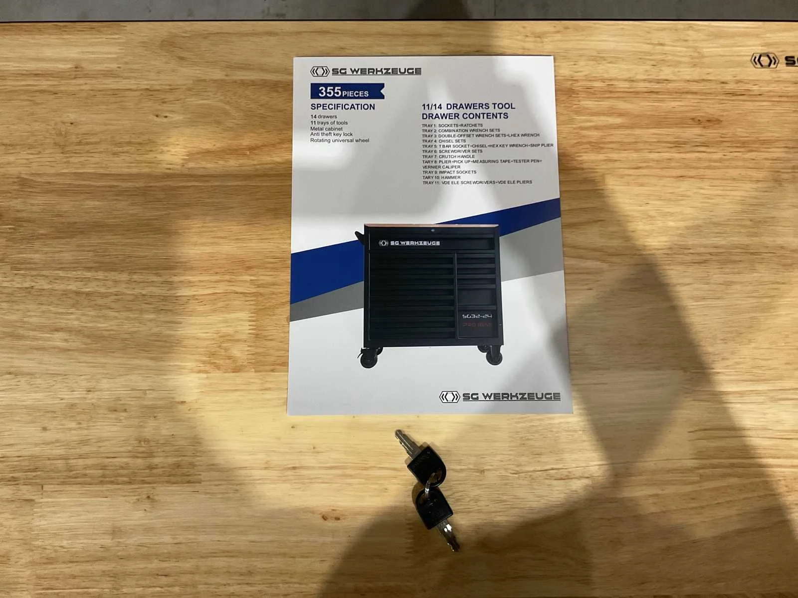 Voorzien van 14 lades waarvan 11 gevuld met gereedschap; professioneel chroom-vanadium gereedschap; heavy duty gereedschapswagen; houten werkblad; 4 wielen; stevig handvat; ongebruikt in doos (transport afmetingen 110x50x100 cm) Merk: SG Werkzeuge Type: SG32-24 Pro Max Bouwjaar: 2025 Aantal laden: 14 Met inhoud: true Eigen gewicht: 159kg Totale afmeting L: 1100mm Totale afmeting Breedte: 500mm Totale afmeting Hoogte: 1000mm