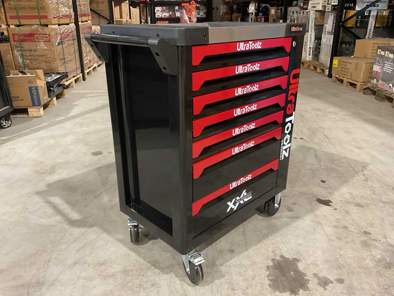 Voorzien van 7 lades waarvan 7 gevuld met gereedschap; professioneel chroom-vanadium gereedschap; heavy duty gereedschapswagen; stevig werkblad; 4 wielen; stevig handvat; ongebruikt in doos (transport afmetingen 80x50x85 cm) Merk: UltraToolz Type: Germany 7/7 Bouwjaar: 2025 Aantal laden: 7 Eigen gewicht: 76kg Totale afmeting L: 800mm Totale afmeting Breedte: 500mm Totale afmeting Hoogte: 850mm