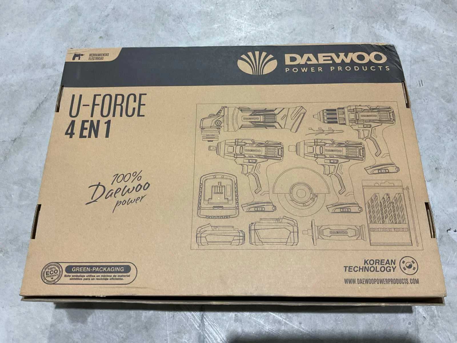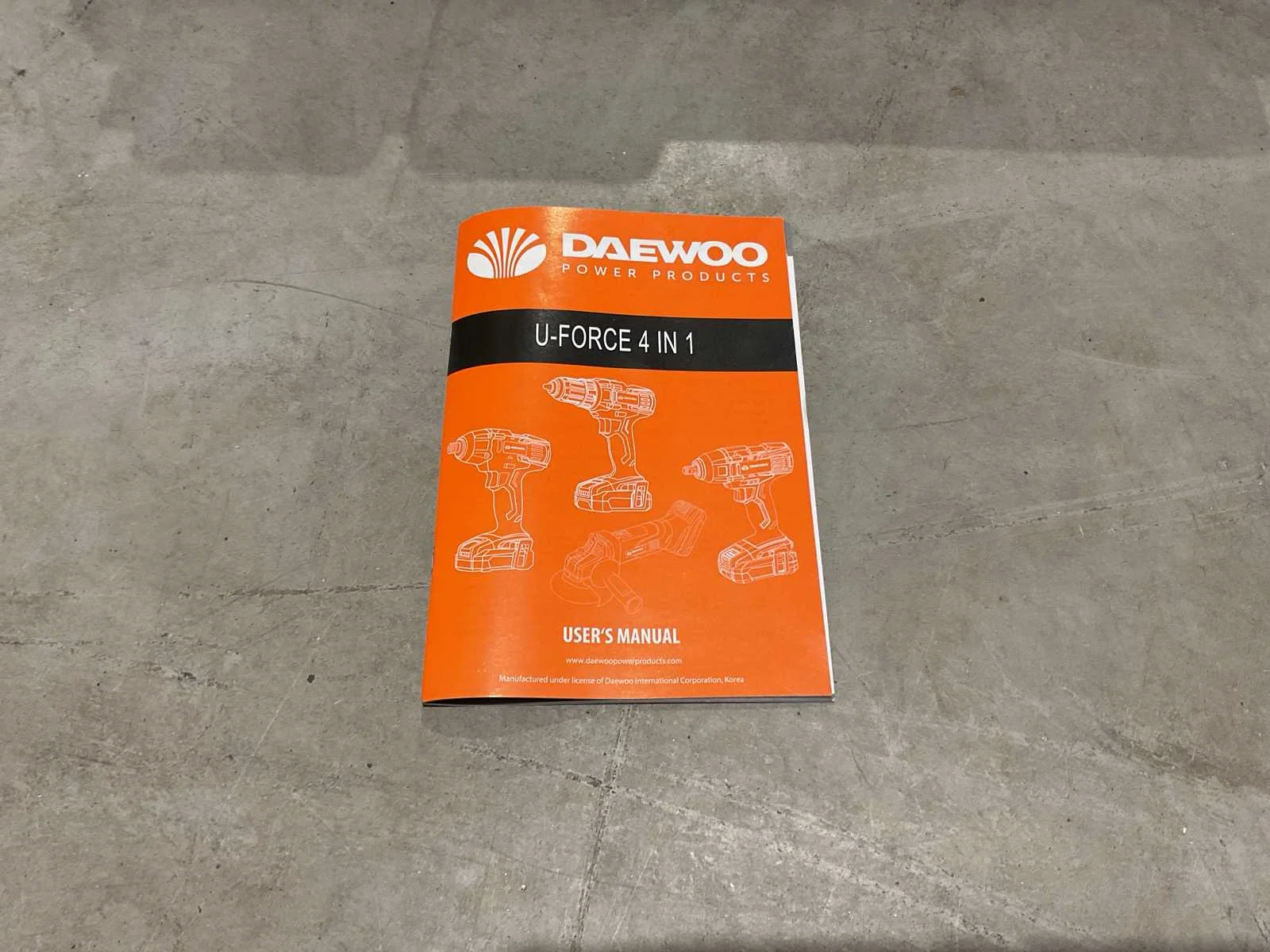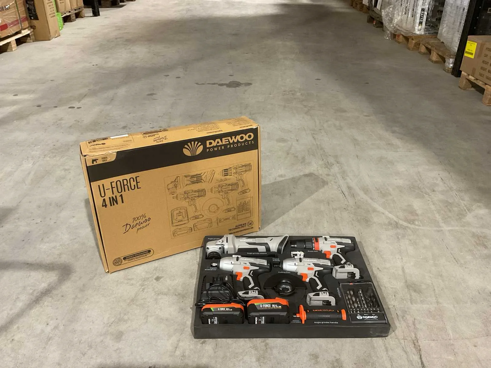 Voorzien van haakse slijper; slag moersleutel ; accu boormachine ; slag schroevendraaier; 2 accu; 4 slijpschijven; 3 steenboren 5-6-8; 3 staalboren 5-6-8; 3 houtboren 5-6-8; Ongebruikt in doos (Afmeting transport verpakking 405x560x120 mm lxbxh, gewicht 8 kg) Merk: Daewoo Type: U-FORCE 4 in 1 Bouwjaar: 2025 Delig: 4 Aansluiting: 20V